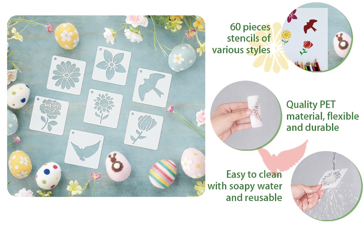 - 60 Unique Styles: You will receive a pack of 60 PET material stencils, each featuring a different fun and cute design. With a variety of shapes to choose from, you'll have endless possibilities for creating DIY art projects. Share with friends and family to make your creations even more special.
