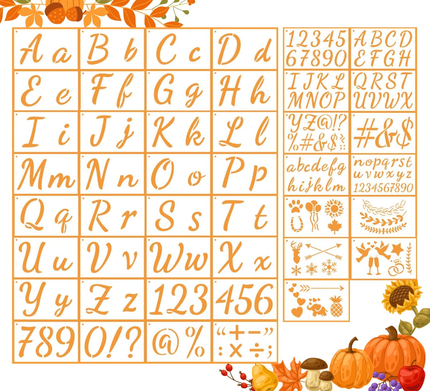 - Most complete bundle - 45 pcs stencil letters contains over 175 characters ( 2 Sets of Letters, each with 26 uppercase letters and 26 lowercase letters, 3 Sets of numbers, each with 10 figures, 26 Common Signs and some patterns) and 1 Pcs Metal Ring