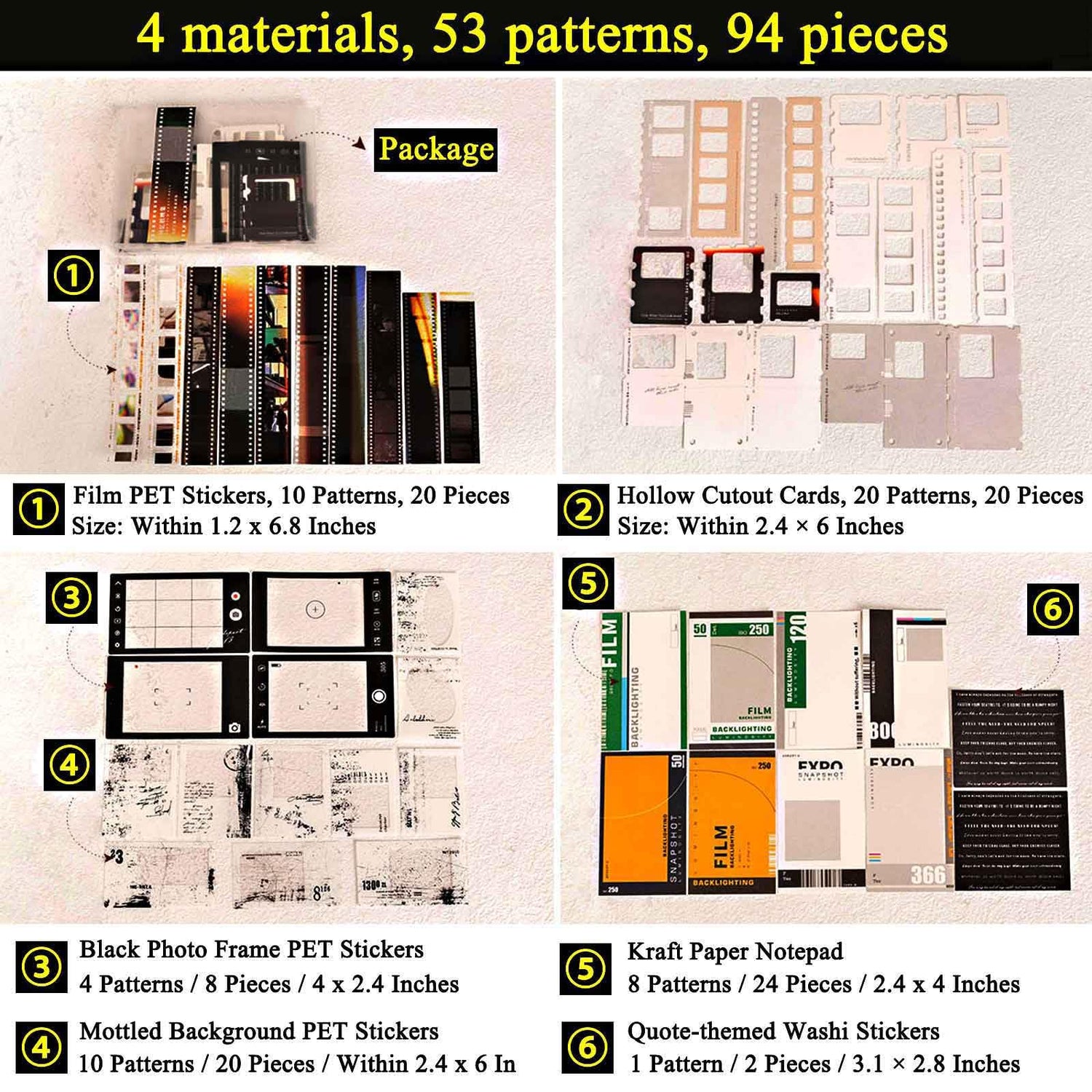- Package Includes – Everything you need to start creating is in this 94-piece scrapbooking paper pack. It includes 20 film PET stickers, 20 hollow cutout cards, 8 black photo frame PET stickers, 20 mottled background PET stickers, 24 kraft paper notepads, and 2 sheets of quote washi stickers. Perfect for journaling, scrapbooking, and DIY crafts!