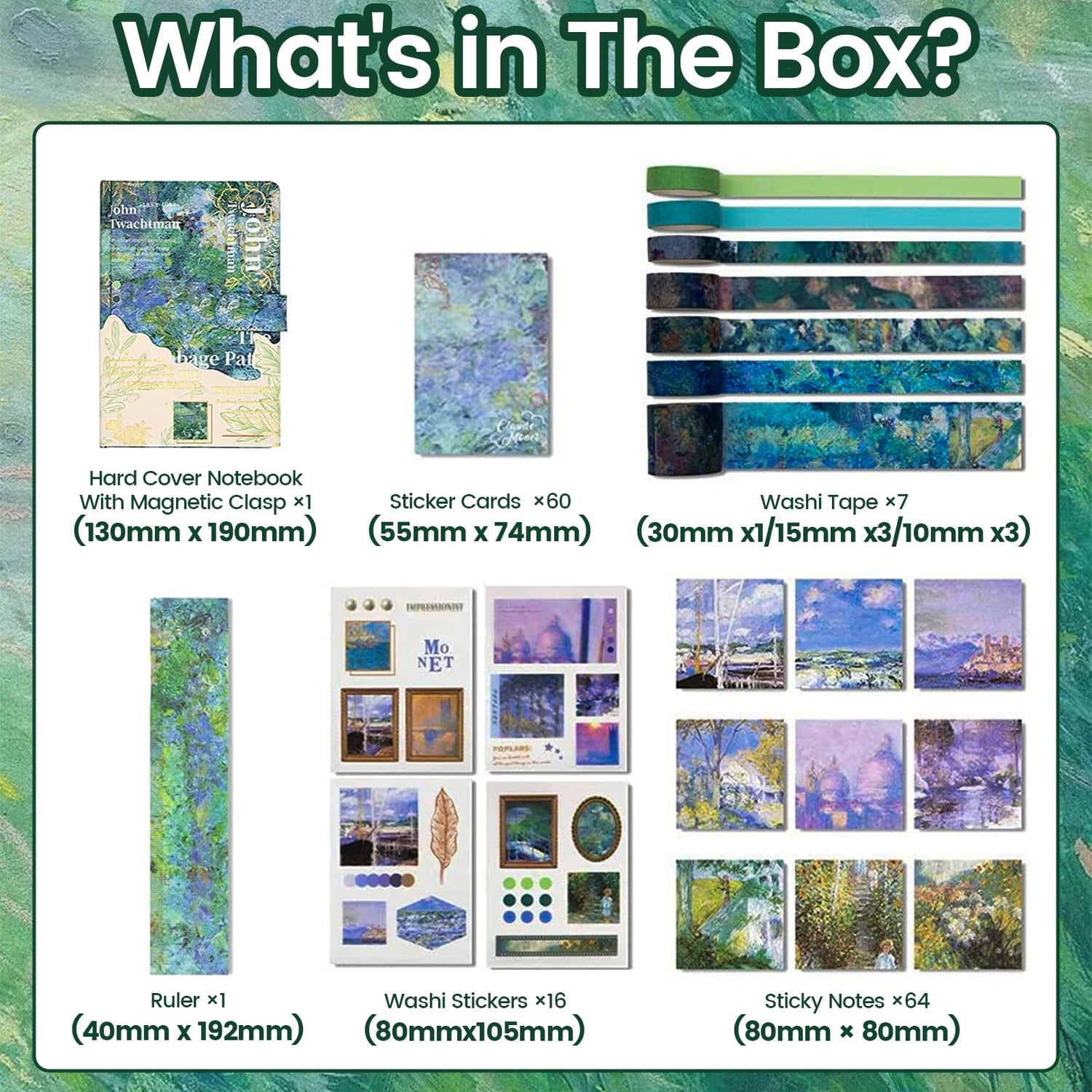 - Great Starter Set: Art kit for journalers. Comprehensive craft supplies include: 1 hardcover color page notebook (magnetic ledger), 60 sticker cards, 1 ruler, 7 washi tapes, 19 washi stickers, complete journaling supplies for diary journeys.