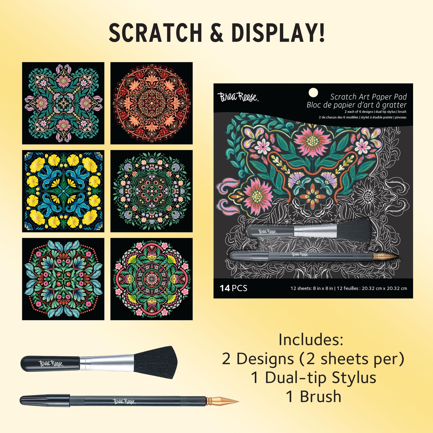 Brea Reese® Scratch Art Paper Pad - Mandala 8x8, 12 Designs, Metallic Guided Art Craft, Easy to Frame Art & Home Decor, Mindful Relaxation