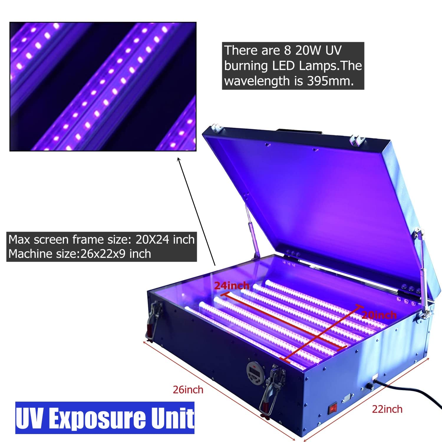- 【LED UV Exposure Unit Exposure】This exposure unit with countdown timer.Timer will turn off the light automatically according to the setting.Max screen frame size: 20 X 24inch(54x64 cm external diameter);Wavelength:395mm.8 LED UV(ultraviolet) fluorescent lights makes exposure evenly.