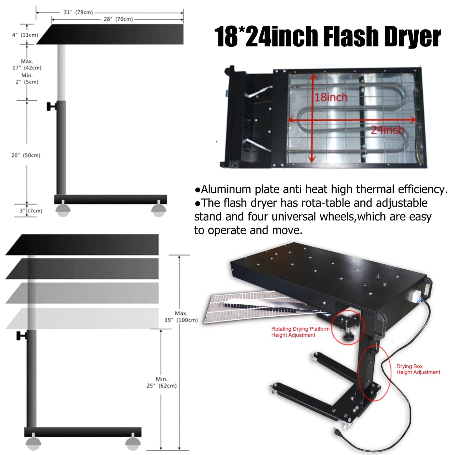 - 【Rotating and Adjustable Flash Dryer】 The flash dryer adopts 1800w stainless steel heating tubes and hot aluminum plate will achieve higher drying efficiency.Adjustable height floor stand from 25" to 39".The height of the platform can be adjusted within 1.6" for according to the drying need. The platform can be move left or right.Size:18"x24" inch (45x60cm).