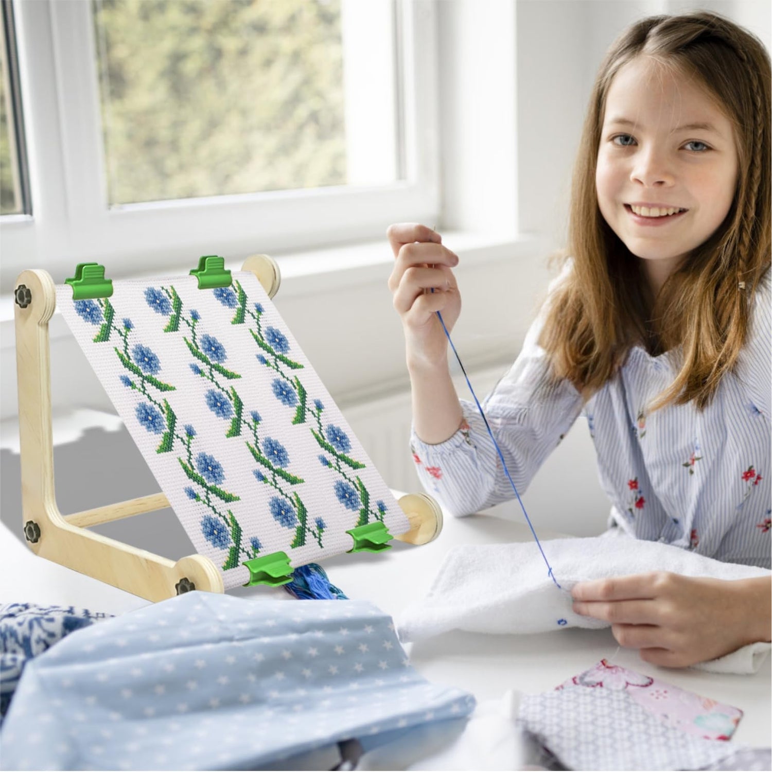 - Premium Adjustable Design for Versatile Crafting: Package includes 2 pack embroidery frame stand with 2 sizes rods (11.8" and 15.75") and 10 plastic clips; Crafted from natural wood, this embroidery stand features a hand-polished, splinter-free surface for smooth handling and fabric protection. The 360-degree rotating frame allows effortless scrolling, while the adjustable height and angle adapts seamlessly to tabletop or lap use, ideal for cross-stitch, needlepoint, quilting, or tapestry