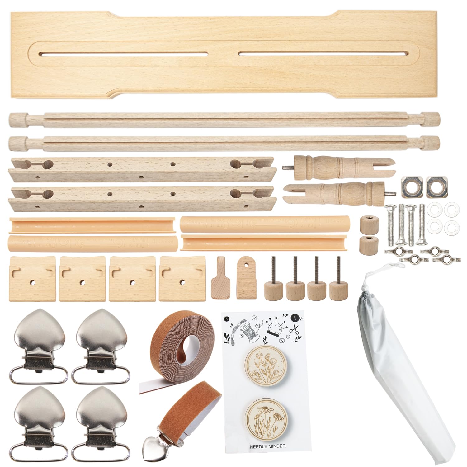 - Package Includes: 1 set of Embroidery Hoop Stand with Free 4pcs metal clips, 4pcs beachwood clips, 1pcs velcro tape, 2pcs needle minder.