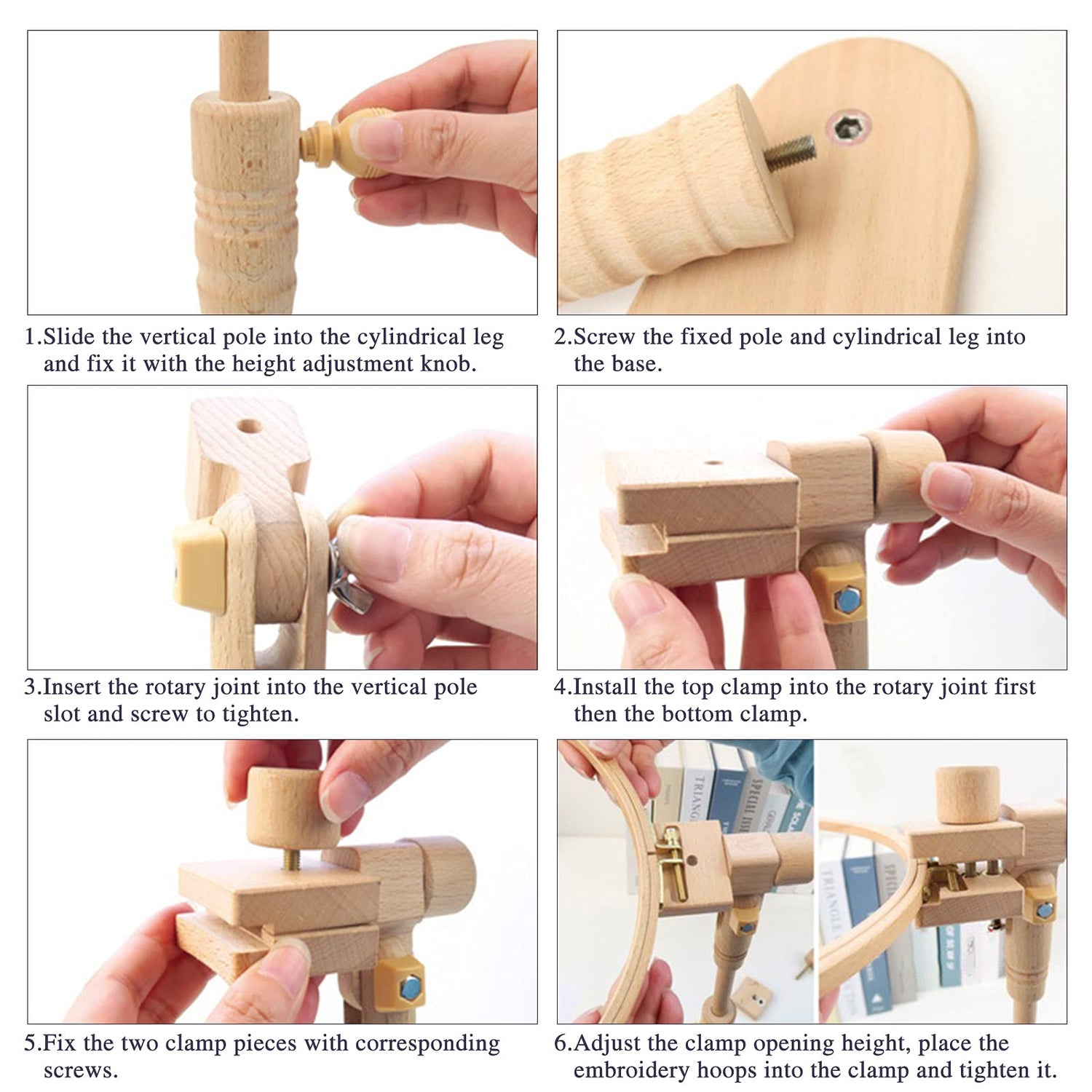 - EASY TO ASSEMBLE AND CHANGE HOOPS: The compact wood embroidery stand can be installed, detached and stored easily. You can insert embroidery hoops of different sizes and shapes (round or square) freely into the hoop clamp only if it’s diameter is less than 15.7" and thickness less than 0.4". Happy stitching with the handy stand
