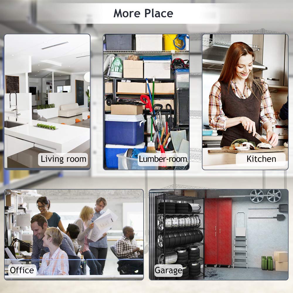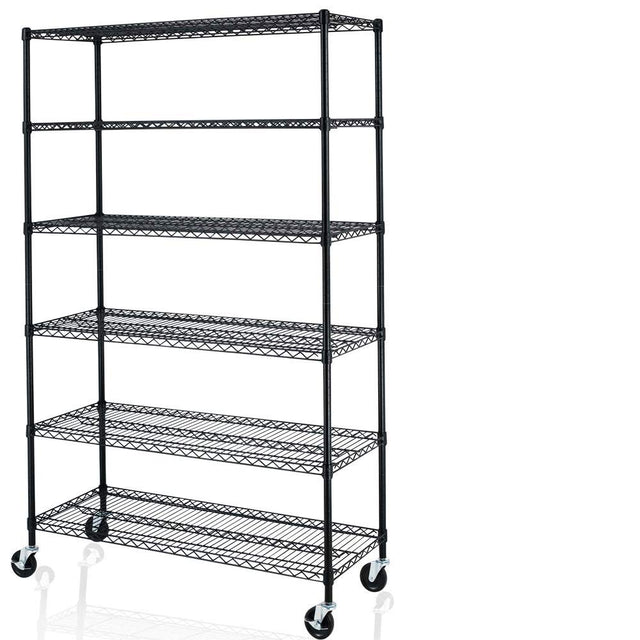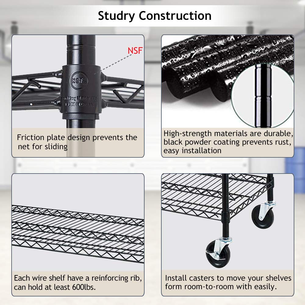 - đăHeavy Casters Roll Effortlesslyă-The strong unit wheels with ball bearing swivels and locking brakes on two wheels. it's easy to lock and unlock, this makes it easy to rearrange and move your shelves even when loaded.when you want to re-organize your garage with the wheels you just roll the shelf so you can clean the floor and walls.If you want to secure the heavy metal NSF wire shelf rack in place, you can lock it. you can using mobile Rack in different areas as time goes by.