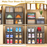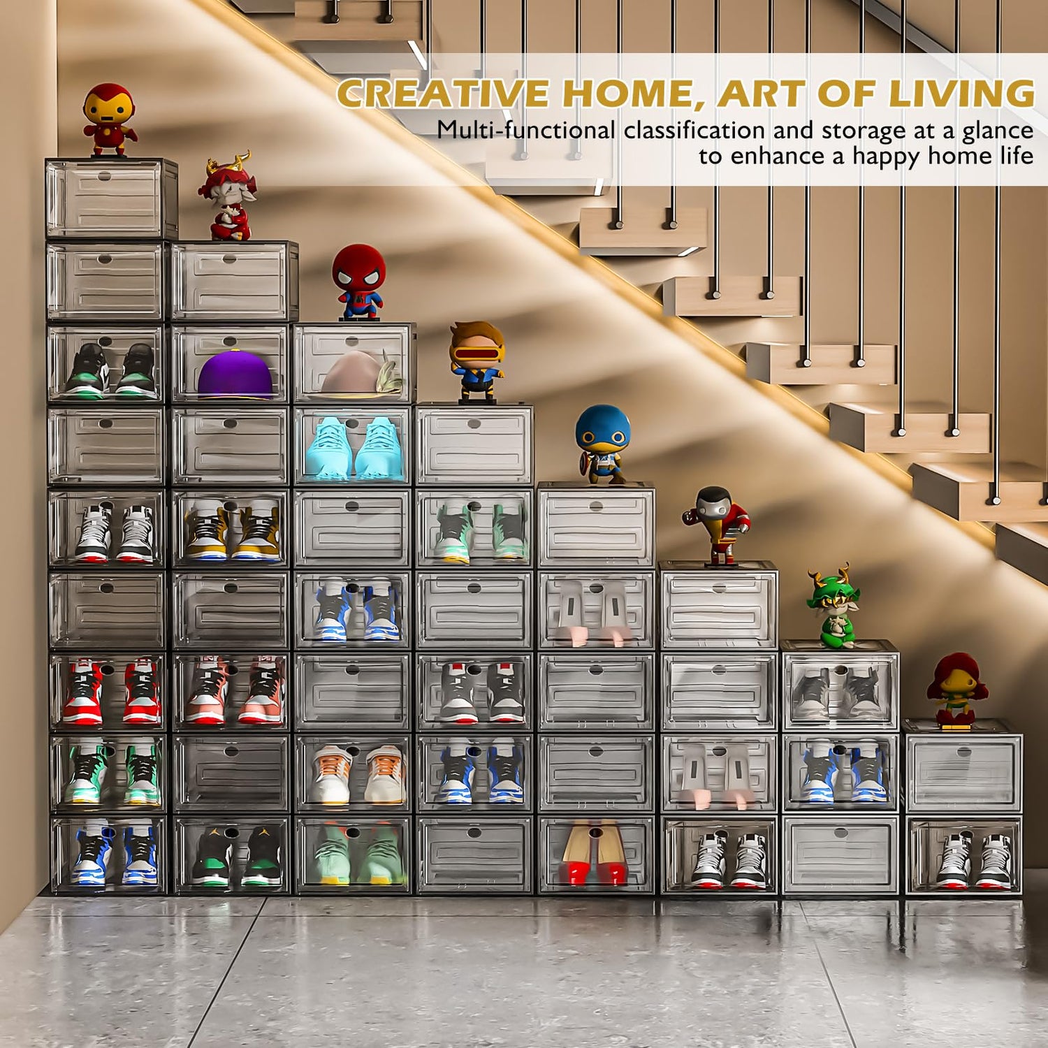 - Clear Shoe Boxes Stackable - Clear magnetic front door, stackable design, harder material, the shoe case provide you a more load-bearing multiple layers of shoe walls.No sliding,safe and stable. Stack easily on side and tops with pegs, you can connect them however you please.