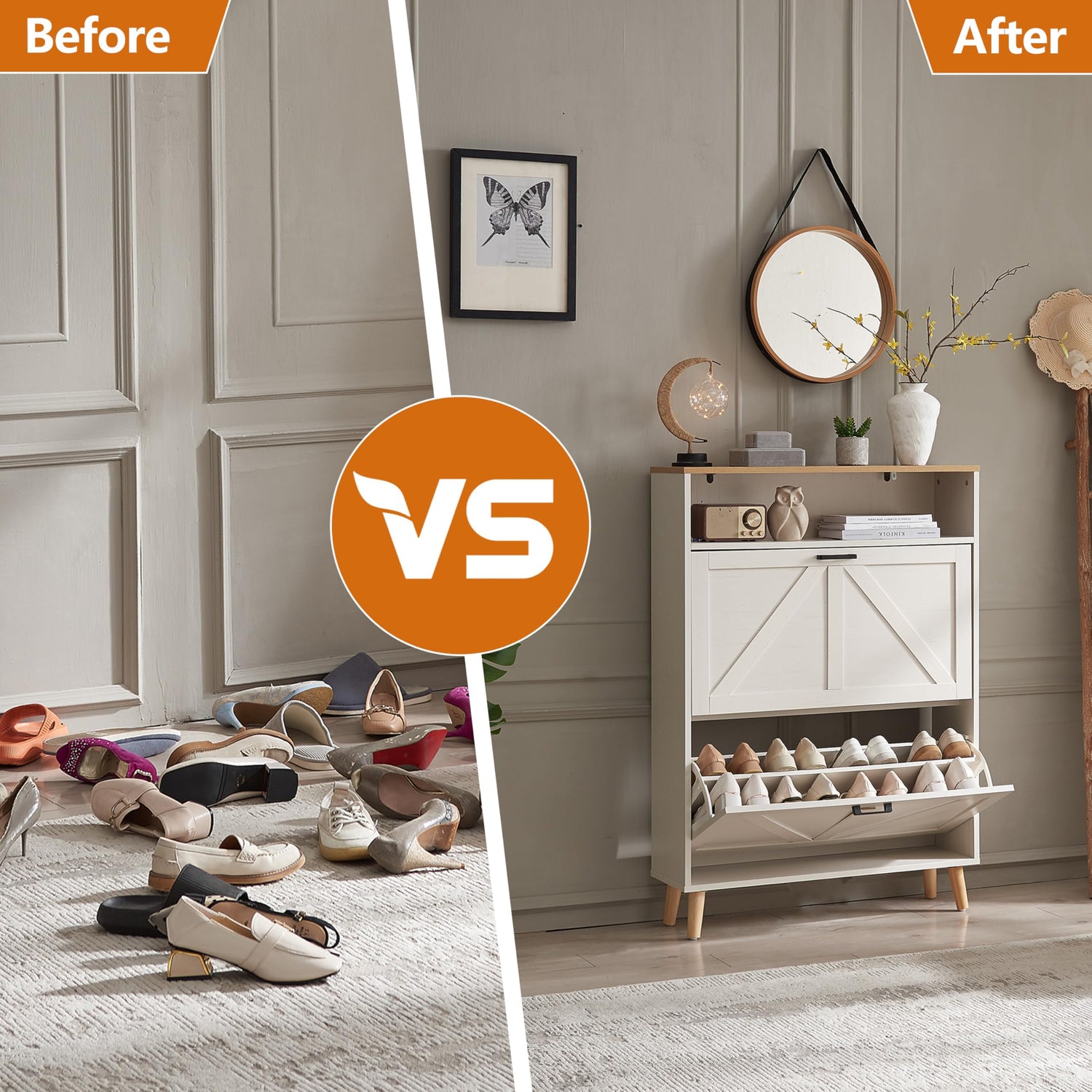 - 【Large Capacity & Family-Friendly Design】 This shoe cabinet for the entryway features two flip drawers, each with two tiers of storage for shoes, accessories, and essentials like keys and wallets. The spacious top surface and open cubby Stoarge offer easy access to daily items, helping to keep your entryway neat and organized. The bottom space is perfect for storing slippers, making it an ideal solution for the whole family