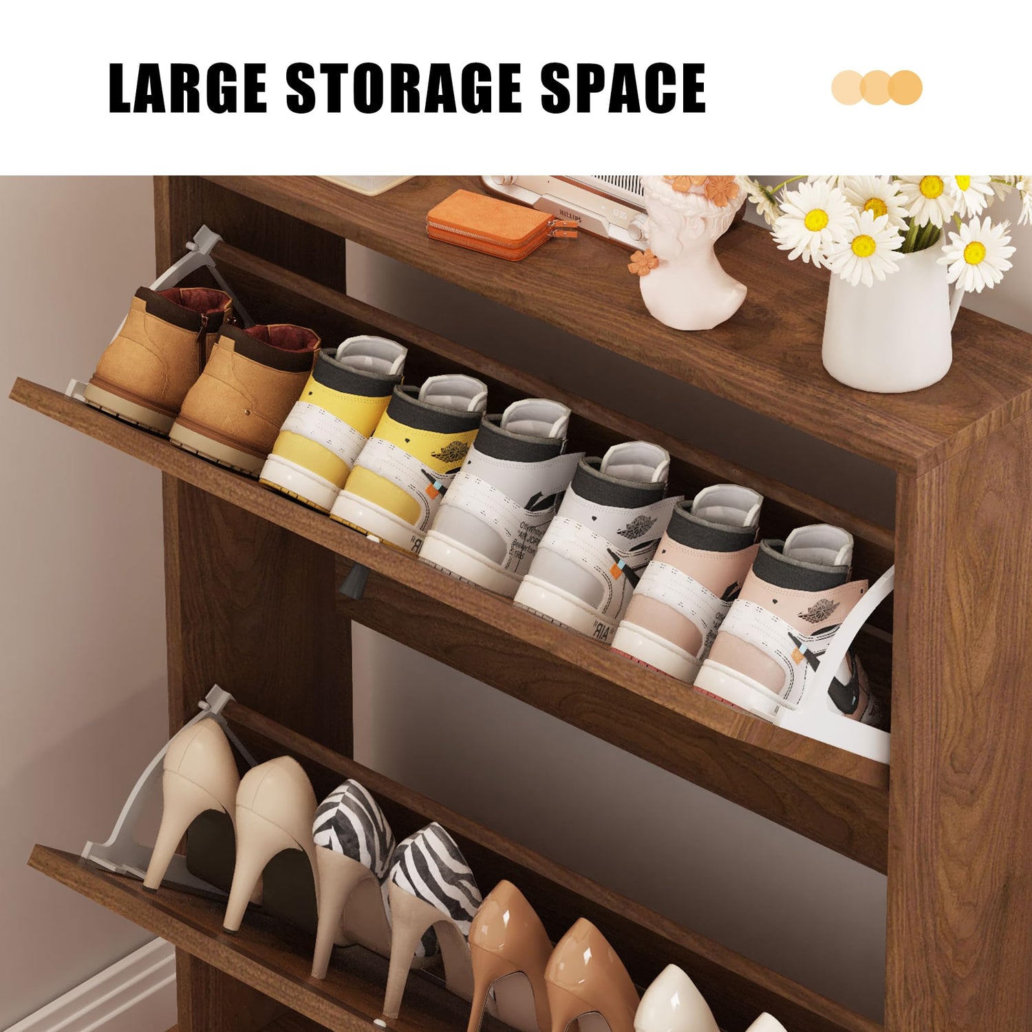 AVZEAR Freestanding Shoe Organizer with 2 Flip Drawer Doors, Entryway & Closet Shoe Storage, Linen Doors, Walnut