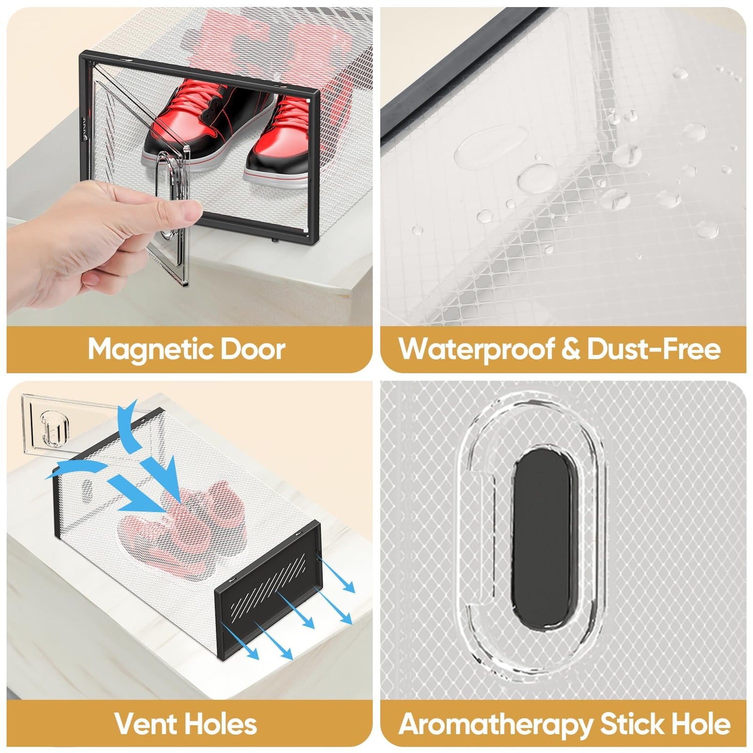 - [UPGRADE VERSION] Larger Space + Magnetic Door + Ventilation Holes + Aromatherapy Stick Hole + Thickened Material. This shoe box offers ample space for your shoes, along with a designated slot for an aromatherapy stick(not included). The door's magnetic closure provides a secure seal to prevent accidental opening.