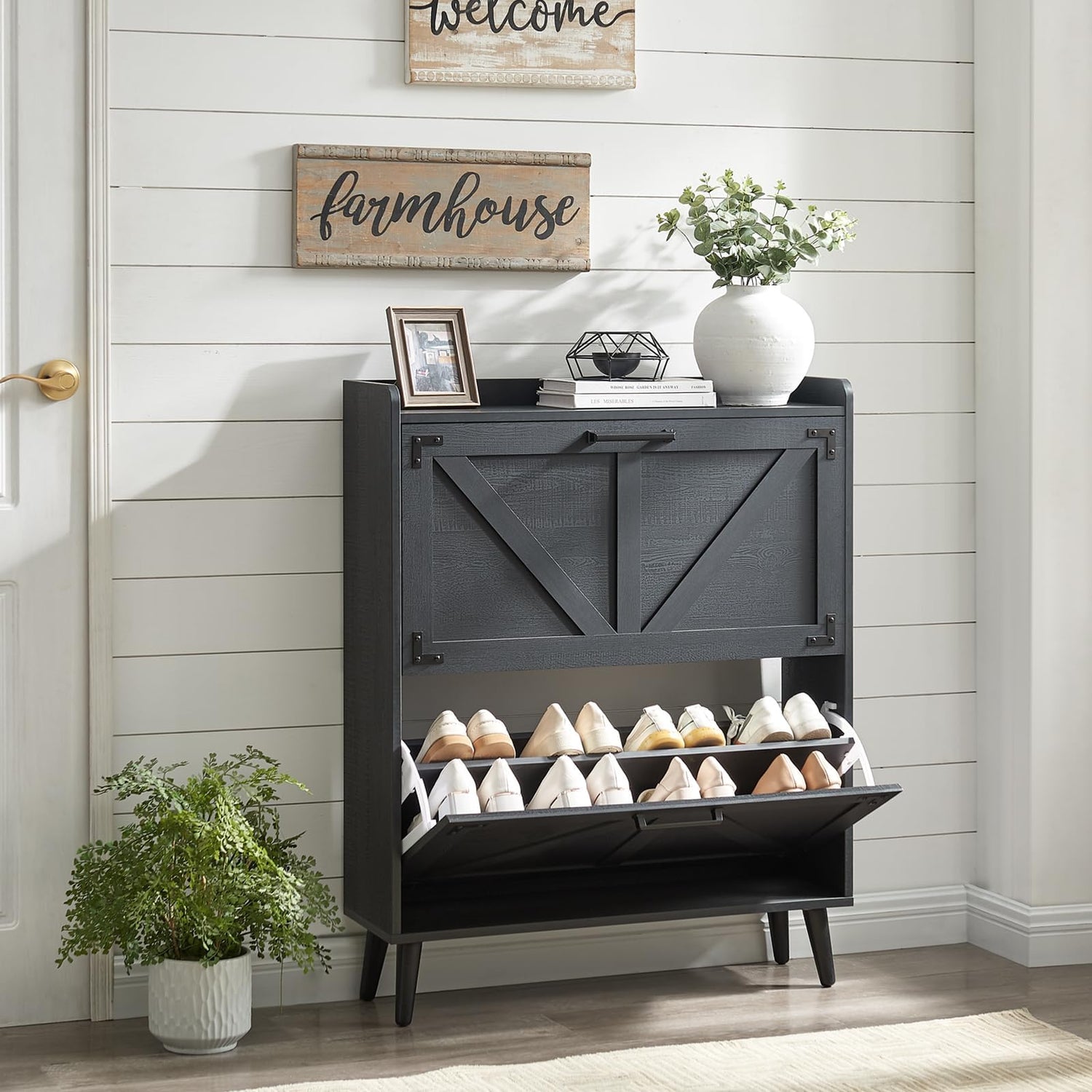- 【Epitome of Practicality and Style】Shoe Cabinet, crafted from durable particleboard.Aside from adding a touch of rustic charm with its barn door farmhouse design, the open-back design of our shoe cabinet also provides ventilation to avoid any foul smell.