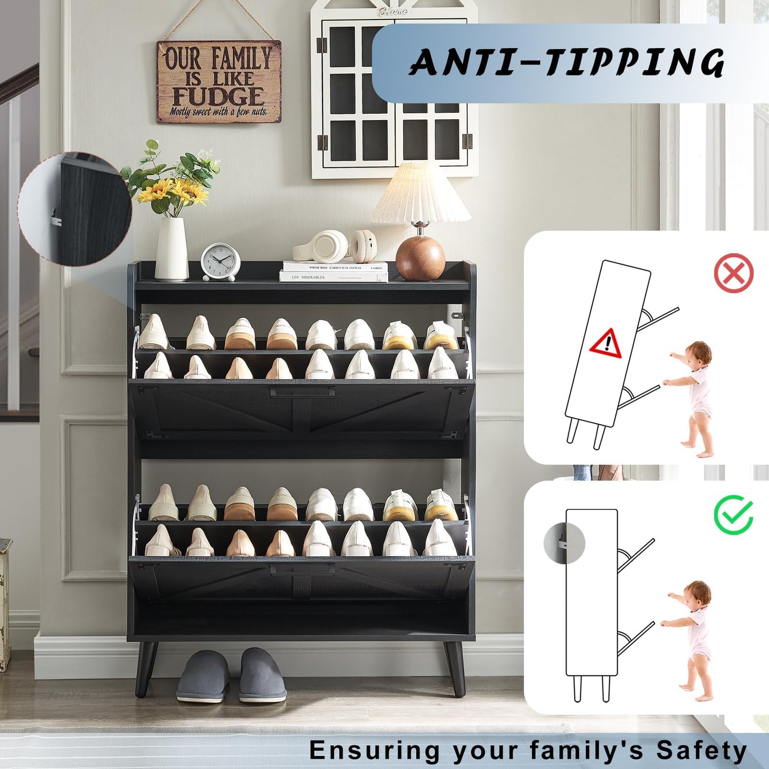 - 【Easy Assembly】For added safety in homes with children, it’s best to secure the shoe cabinet using the included wall mounts.Our shoe cabinet comes with a detailed instruction manual and all the necessary tools included, making assembly a breeze.
