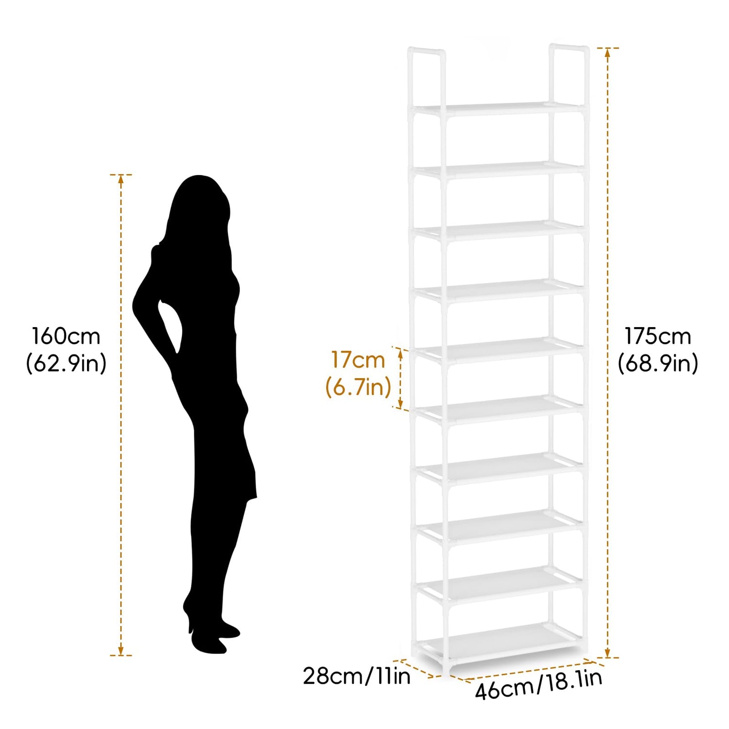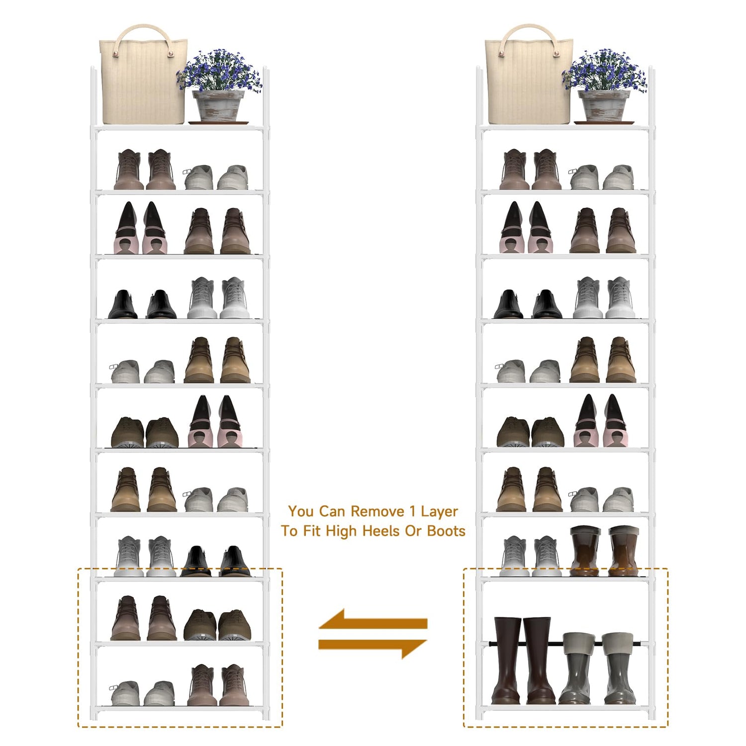 - 【Store Capacity】10 Tier shoe rack can hold up to 20-25 pairs of adult shoes, You can remove one layer to fit boots, high heels, bags, or other larger accessories. Assemble a stackable shoe shelf 10-tier or split it into two Small shoes stand you like.