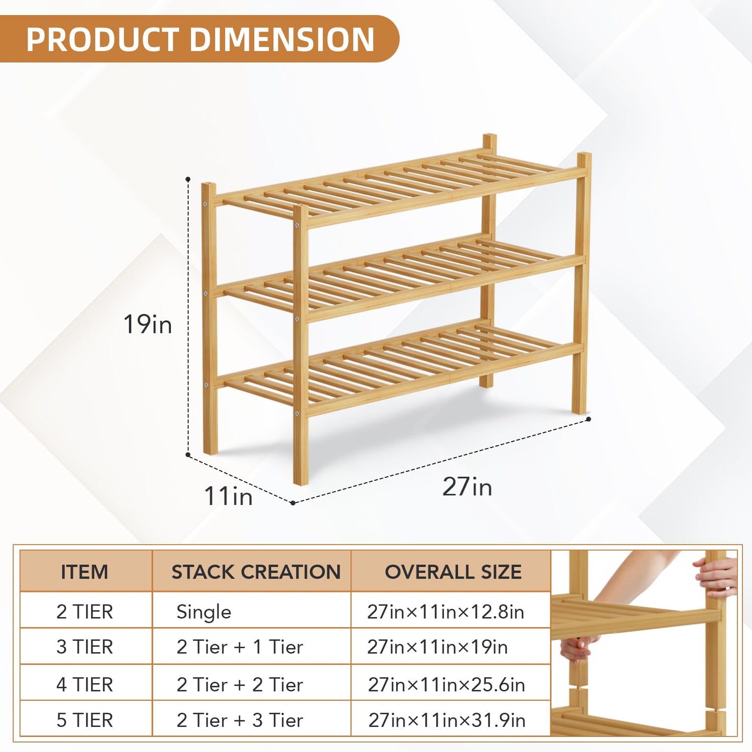 Buymoth 3 Tier Bamboo Shoe Rack Storage Organizer for Closet, Multifunctional Stackable Free Standing Shoe Shelf Organizer for Small Space,Entryway, Hallway, Bathroom 27"x11"x19" (Natural, 3 Tier)