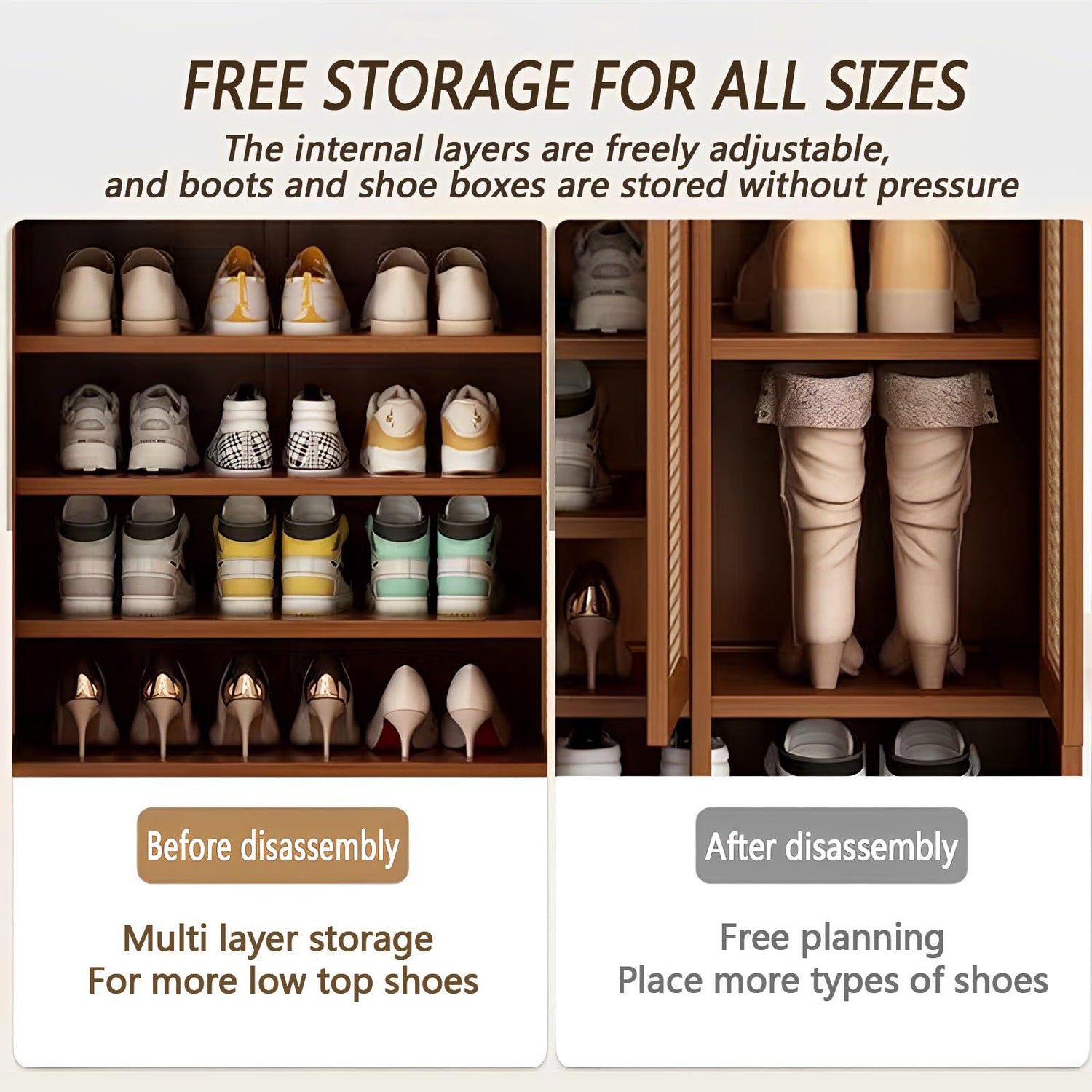 - Large capacity, perfect storage --- The top area is ideal for your preferred decorations. The shoe cabinet with door provides an enclosed space to keep your shoes clean while no piled-up shoes or messy hallway anymore! The top of our large shoe cabinet is raised by 8 inches to effectively prevent items from falling. The cabinet door adopts a double-open folding door, which is easy to take. Cubic storage, making full use of every inch of space