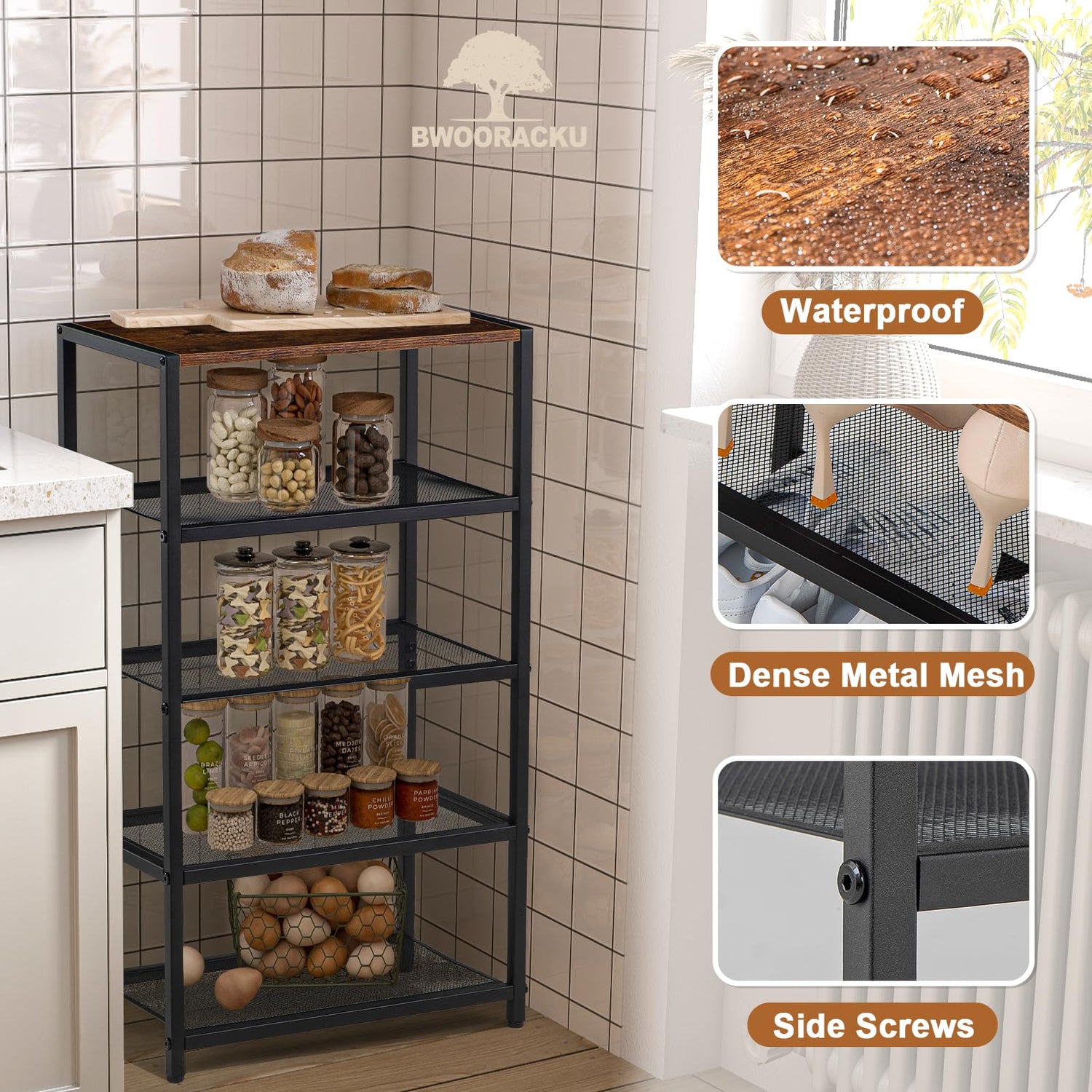 BWOORACKU Shoe Rack, 5-Tier Narrow Shoe Shelf with Dense Metal Mesh, Durable Industrial Freestanding Shoe Rack for Front Door Entrance, Hallway, Entryway, Living Room (29.92" H Rustic)