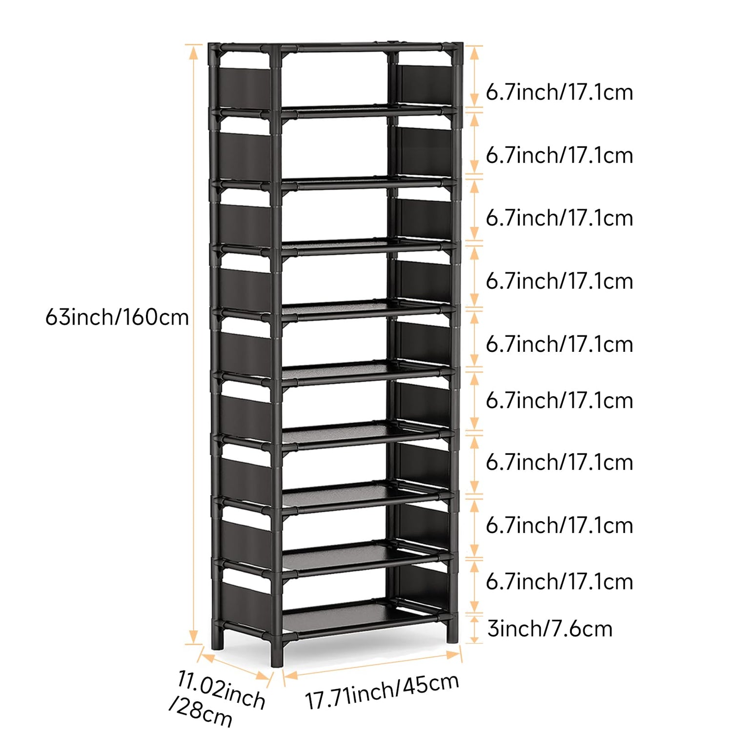 - Space-Saving Vertical Shoe Rack: 10-tier tall shoe rack can hold up 20 to 25 pairs of adult shoes. this narrow shoe rack measures is 17.7 "L x 11"W x 63"H, This tall shoe rack is not only for sneakers boots, high heels, but also for bags, toys, towel, sundries, books, plants and small accessories.
