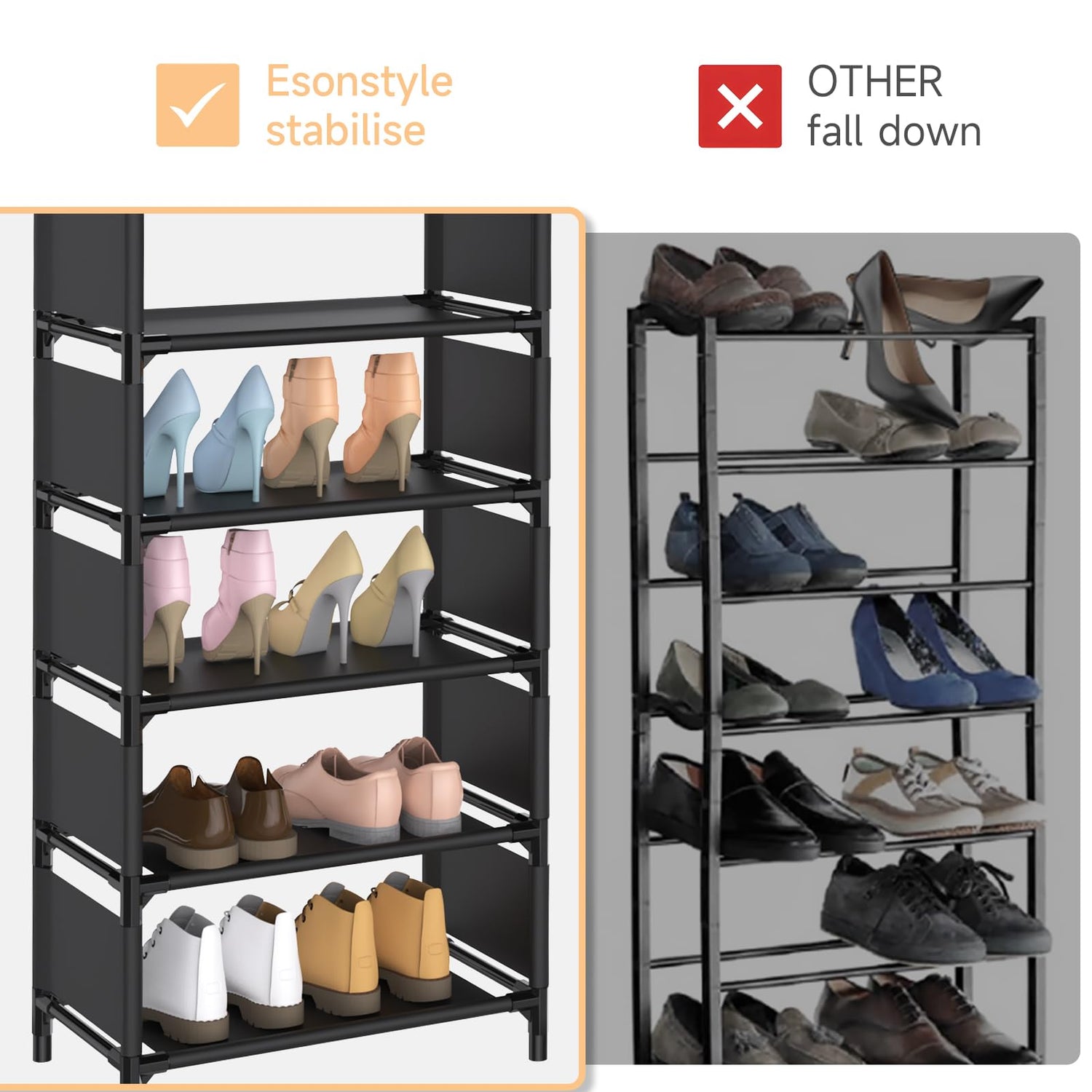 - Durable Tall Shoe Rack: free standing shoe racks made from durable waterproof non-woven fabric tiers and reinforced plastic connectors and thickened iron pipes, that makes this shoe shelf sturdier, stabler and longer lifetime. Non-woven fabric on both sides and the underside, prevent dust and water from falling into other shoes.