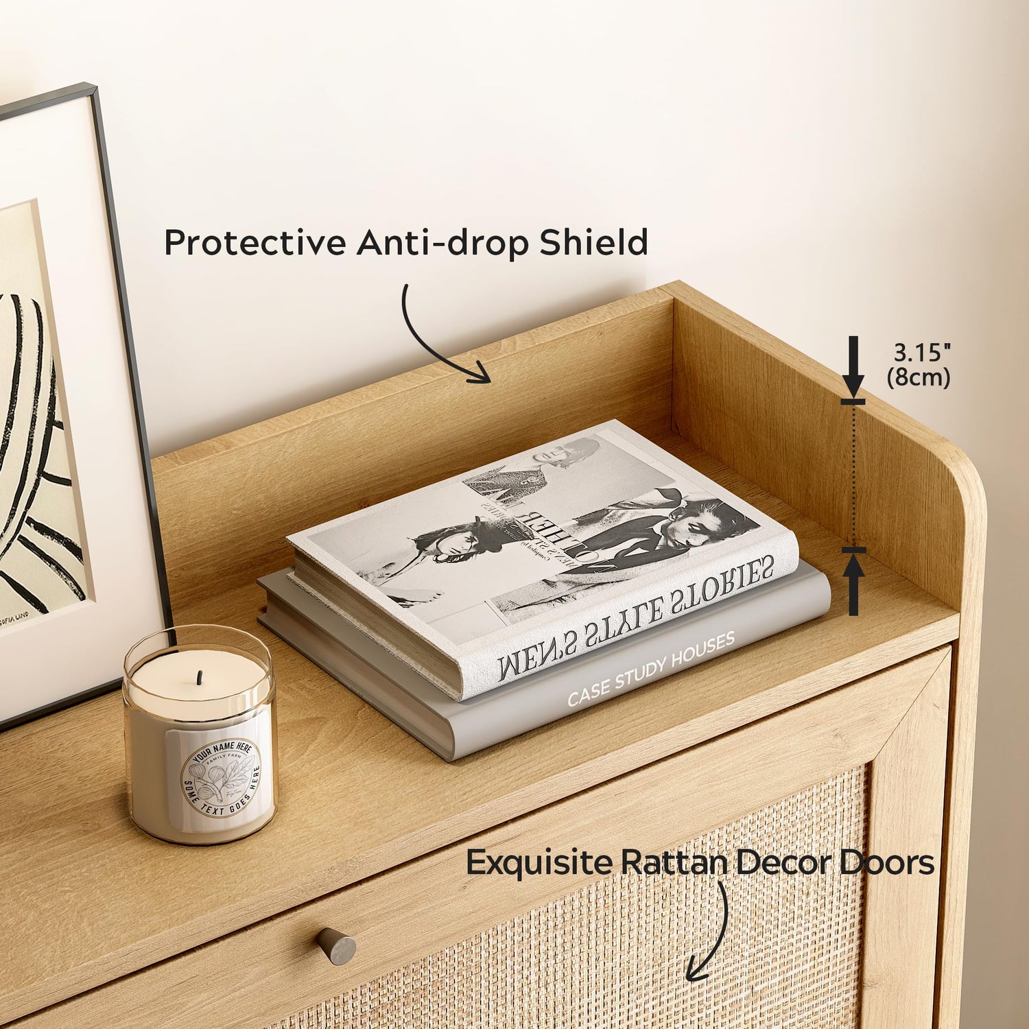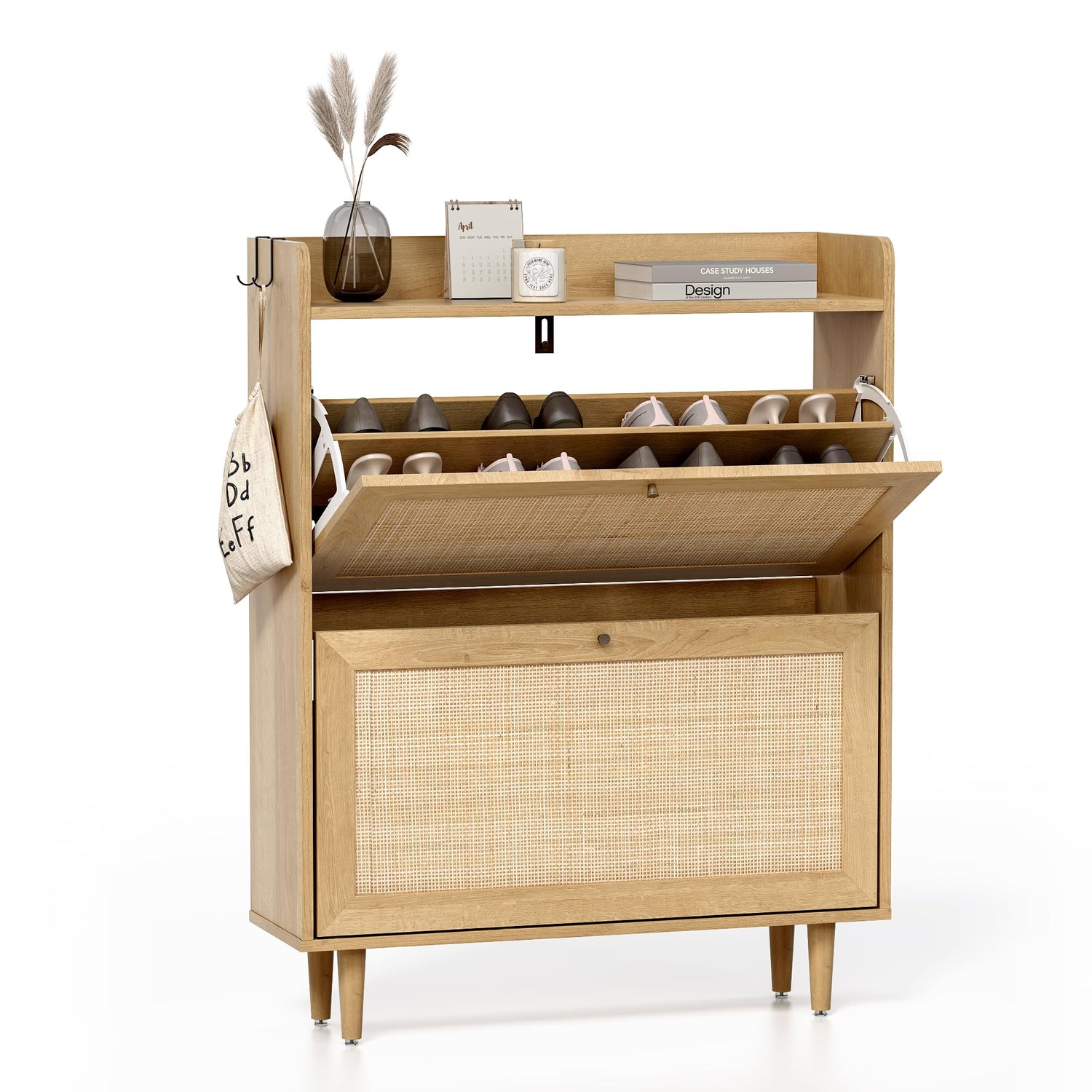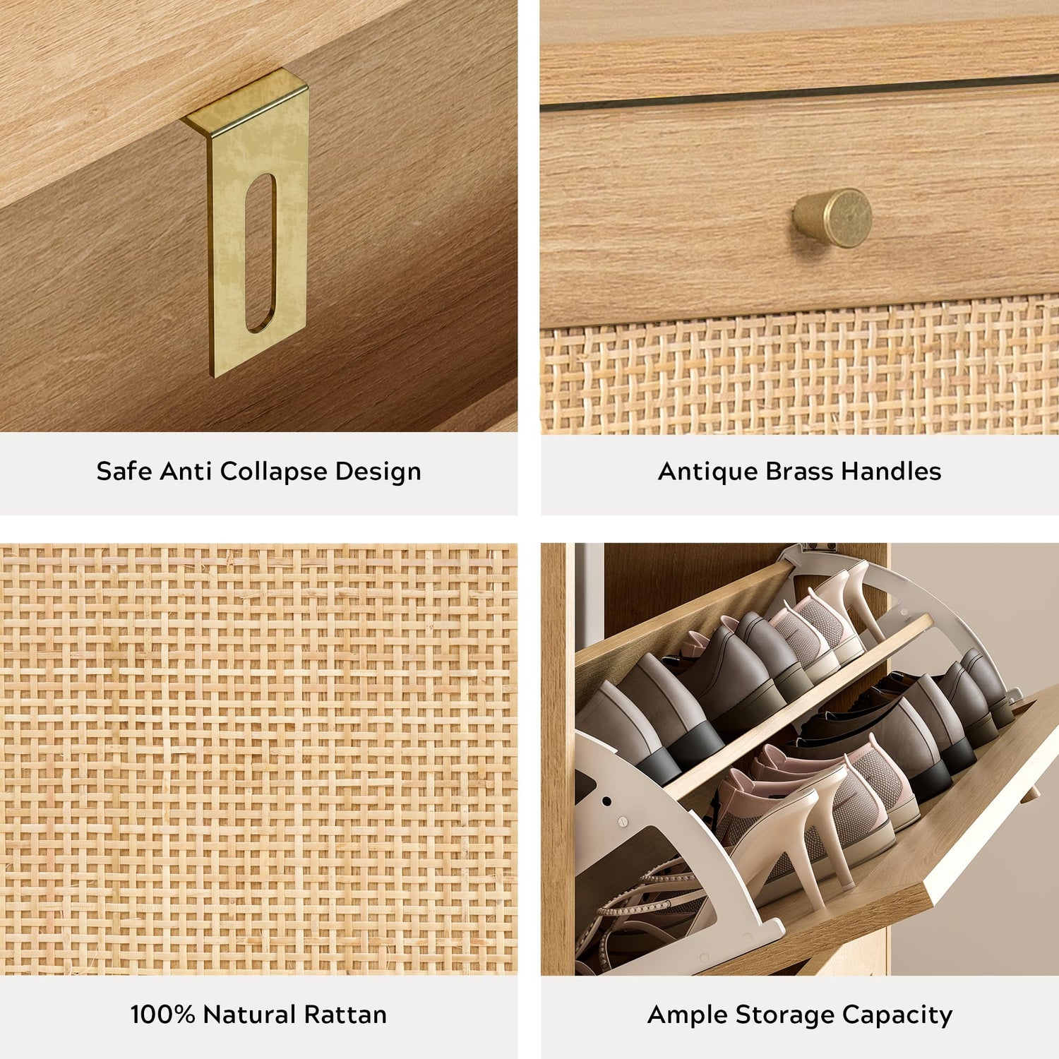 Details: EYYTHUNG Shoe Cabinet with 2 Flip Drawers, Rattan Farmhouse Shoe Organizer, Boho Wooden Hidden Slim Narrow Shoe Rack Cabinet for Entryway, Hallway, Natural Oak