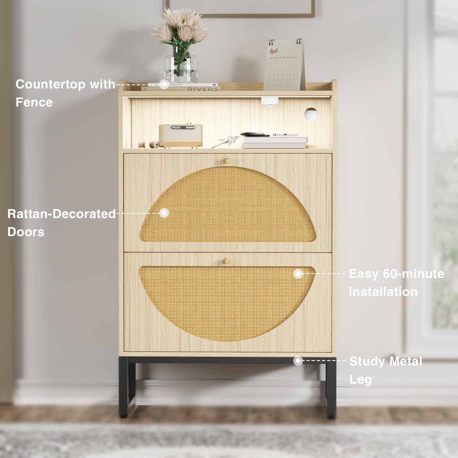 - 【Natural Rattan Style】 Enhance your home's warmth and aesthetic with this entryway shoe cabinet featuring natural rattan design. The intricately woven rattan panels seamlessly complement styles from bohemian to contemporary.