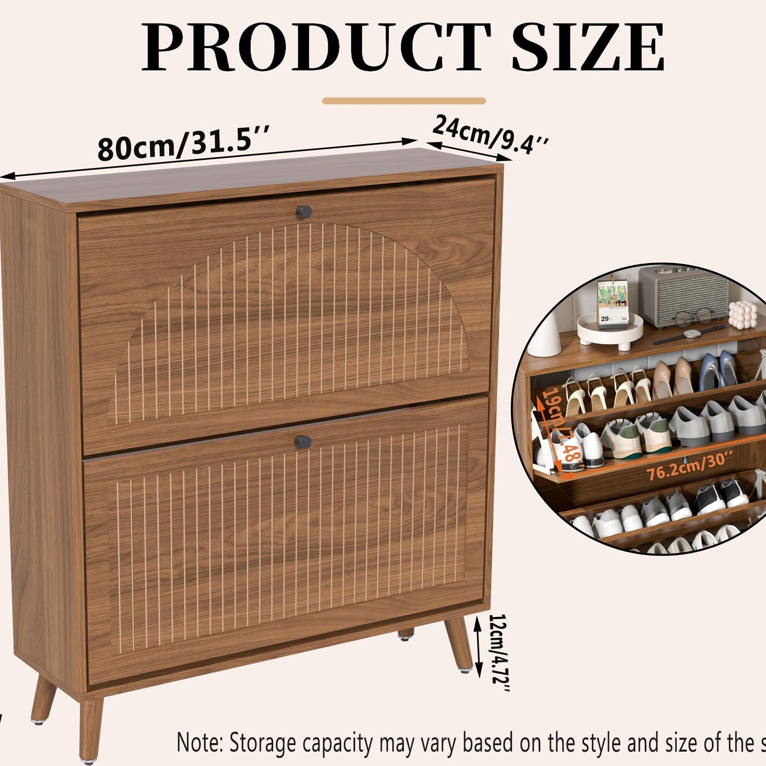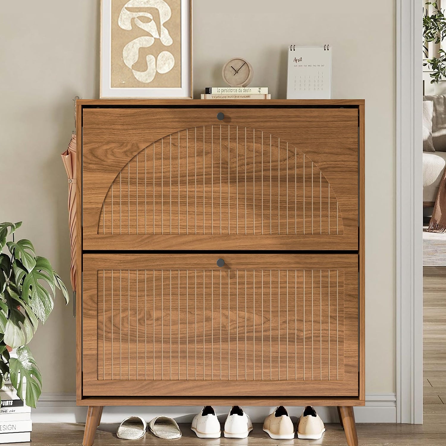 Fsbecl Shoe Storage Cabinet for Entryway with 2 Flip Drawers, Narrow Wood Shoe Cabinet with Fluted Panel, Freestanding Hidden Shoe Organizer for Foyer, Hallway (Walnut)