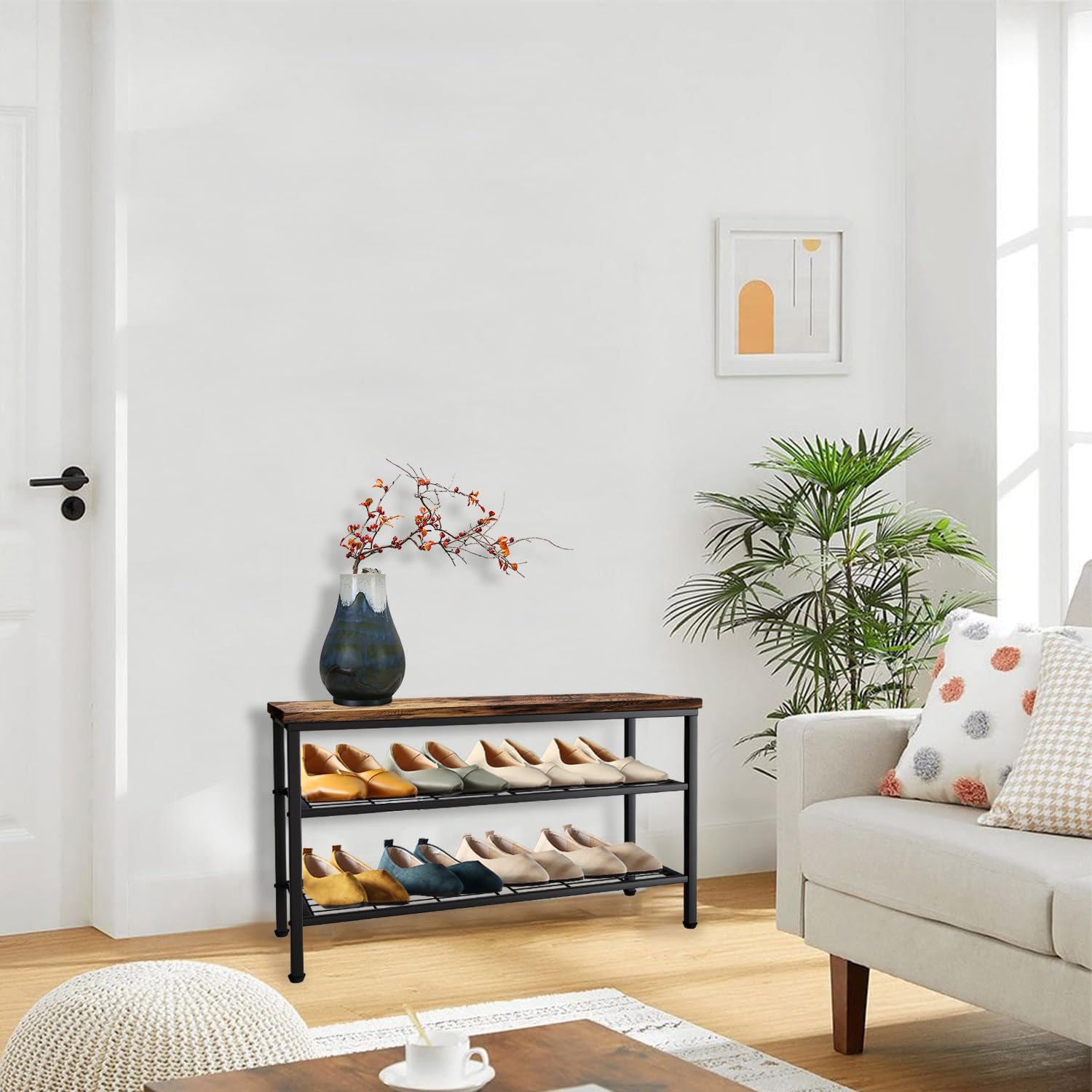 Glynym 3-Tier Metal Shoe Rack with Wood Top - Durable & Space-Saving Shoe Organizer,Industrial Shoe Organizer Shelf Bench Storagefor Closet Entryway, Bedroom & Hallway - Bronze + Black 28.5 W × 18" H