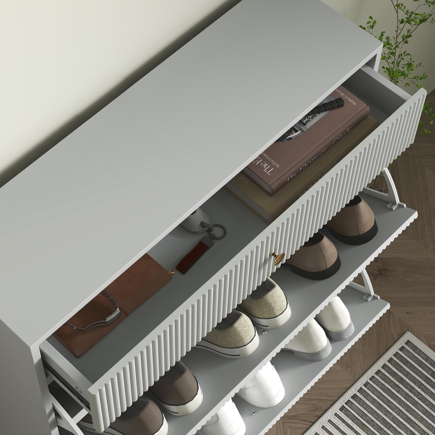 ● Two flip drawers accommodate up to 12 pairs of shoes