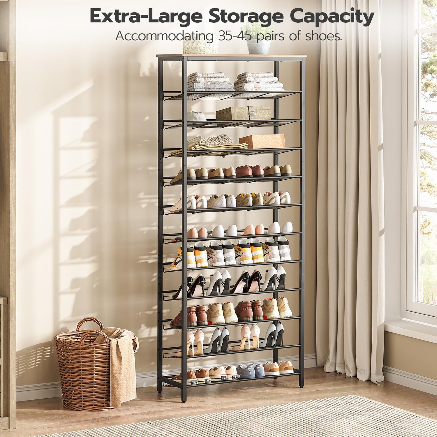 HOOBRO 12-Tier Shoe Rack, Large Capacity Shoe Storage Organizer for 35-45 Pairs of Shoes, Standing Shoe Shelf with Slanted Shelves, for Entryway, Closet, Hallway, Rustic Brown and Black BF51XJ01