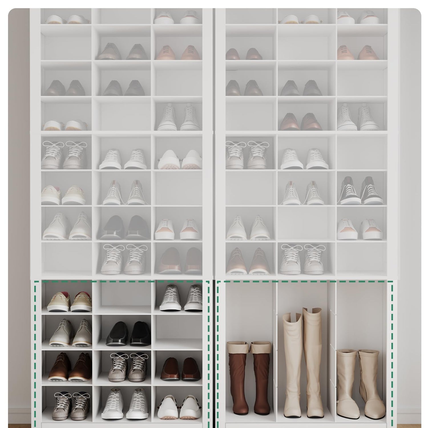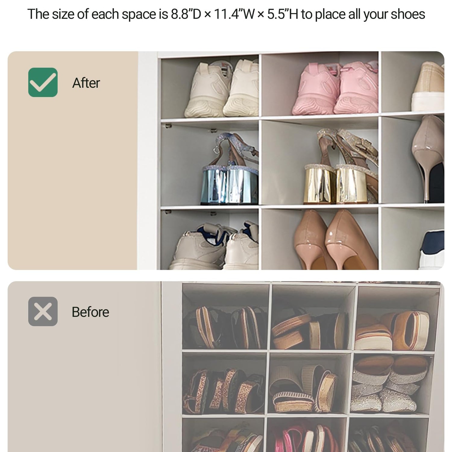 - DIY You Like: 11.4"D x 8.8"W x 5.5"H compartment perfect for flats, sneakers and high heels. You can also adjust some of the shelves to store tall boots and other items.