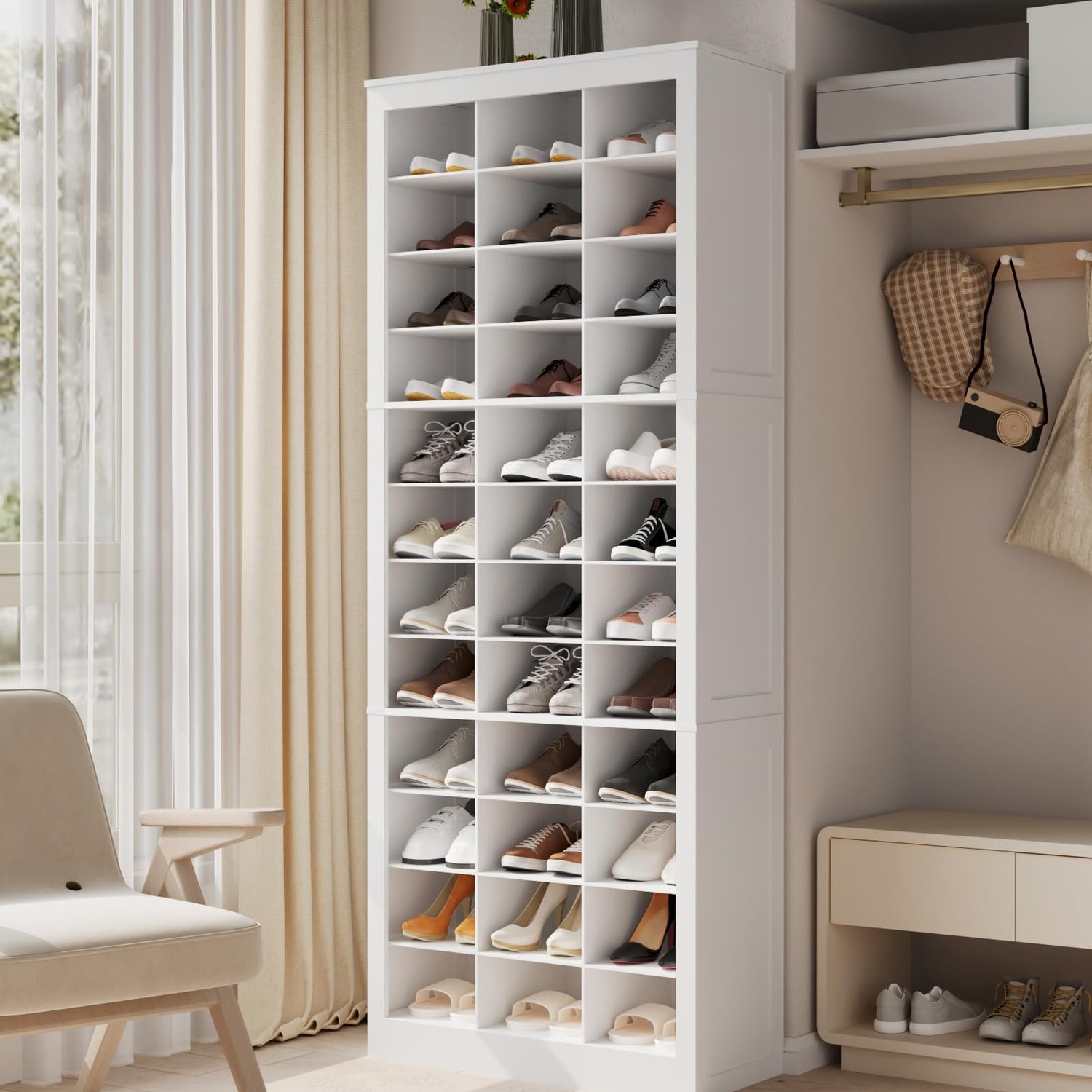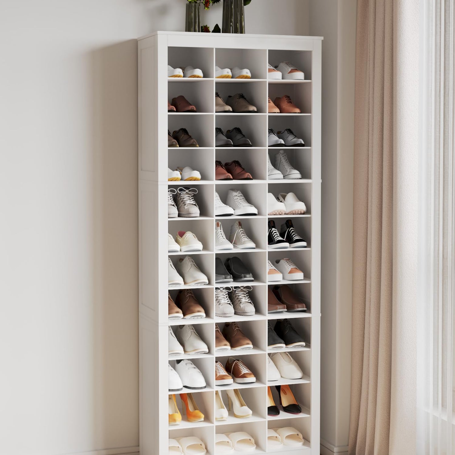 Hzuaneri Shoe Storage Cabinet, 36 Pairs Free Standing Closet Organizer, 8.8 inch Widened Cell Wood Shoe Organizer, 12 Tiers Vertical Space Saving Shoe Rack for Entryway, Bedroom, White SR20703X