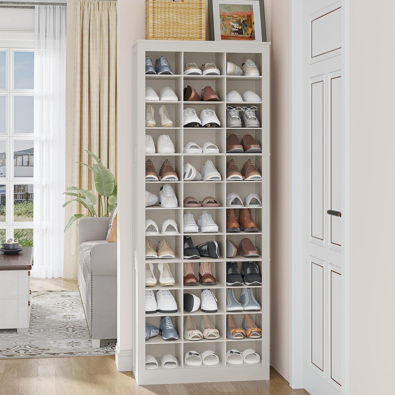 - Space-Saving and Practical Shoe Rack: This tall shoe cabinet measures 12"D x 28.7"W x 72.4"H and can accommodate up to 36 pairs of shoes. Great for use in small spaces. It makes full use of vertical space and takes up very little space, making it ideal for entryways, living rooms, bedrooms, hallways and storage rooms, etc.