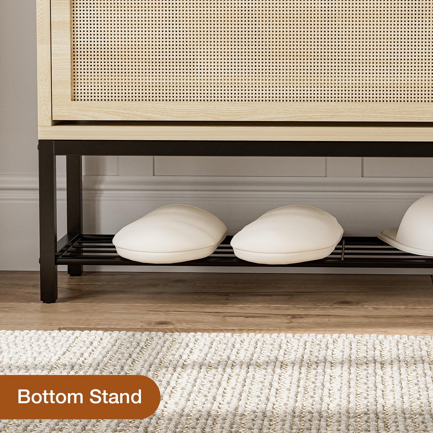 - Natural Rattan Shoe Cabinet:Natural rattan is used as the material of the door panel, which is environmentally friendly and natural. The rattan shoe cabinet is made of MDF, rattan, stable and durable. The metal legs under the shoe storage cabinet greatly increase the stability and are not easy to tip over