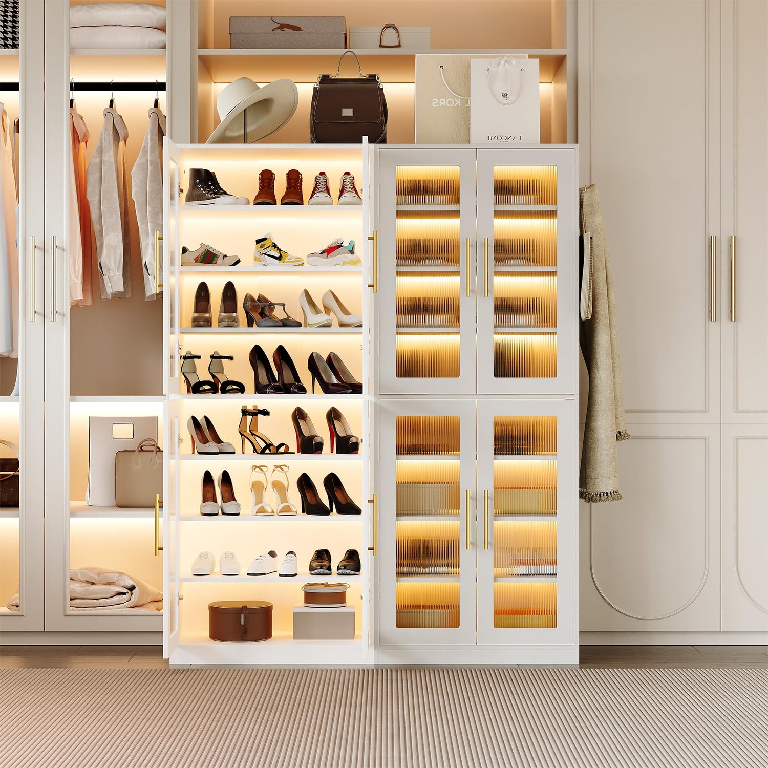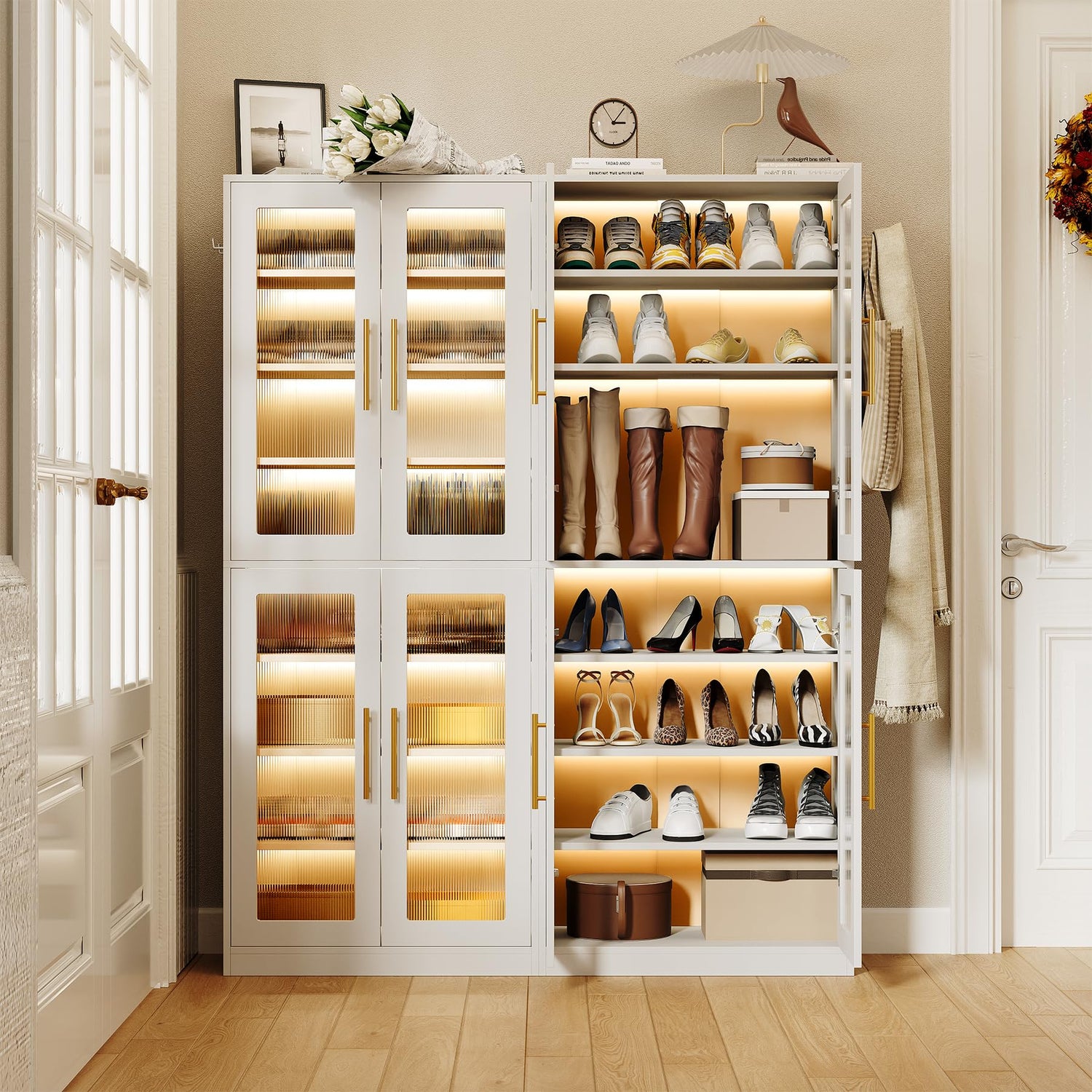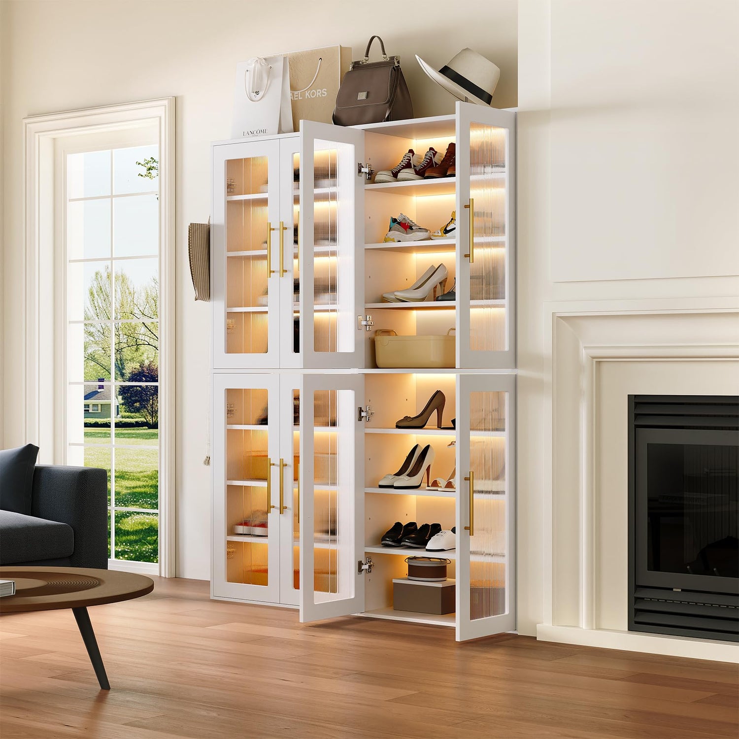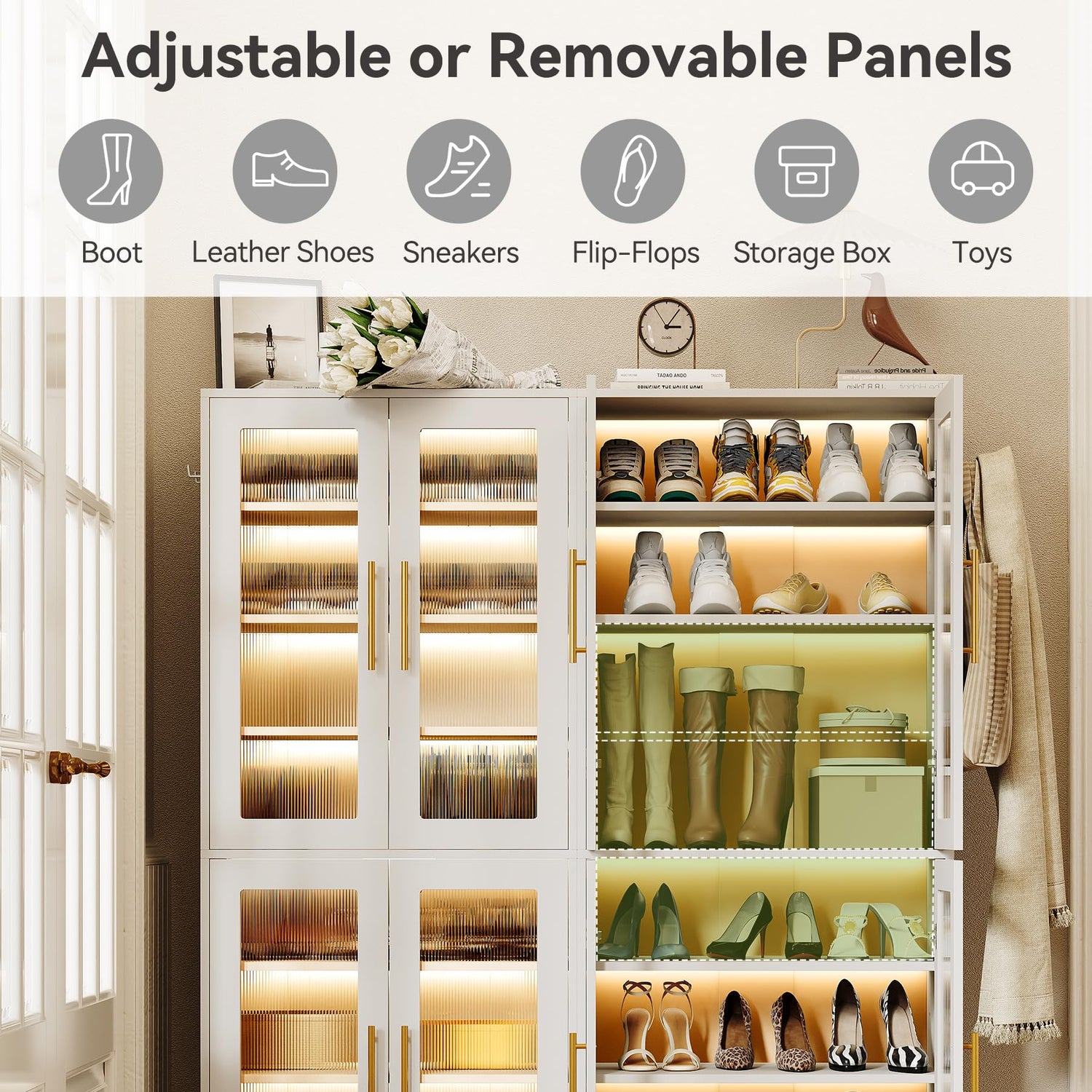 LITTLE TREE Stylish 8-Tier Vertical Shoe Rack with Built-in LED Lighting, Doors for Dust Protection, and Convenient External Hooks, Shoe Cabinet for Entryway, Living Room, Bedroom, White