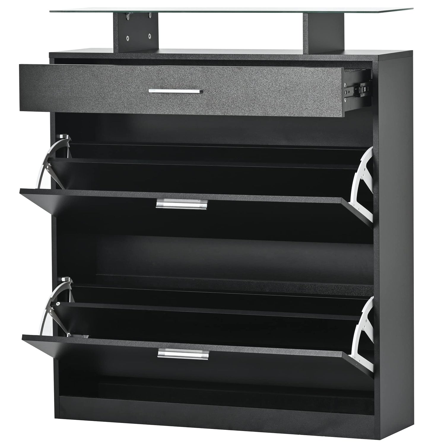 - Great Storage Capacity: The two flap drawers are practical for up to 16 pairs of shoes. It also includes a handy drawer with extra space for accessories like shoe polish or extra laces. The glass top is also a great place to display decorations.
