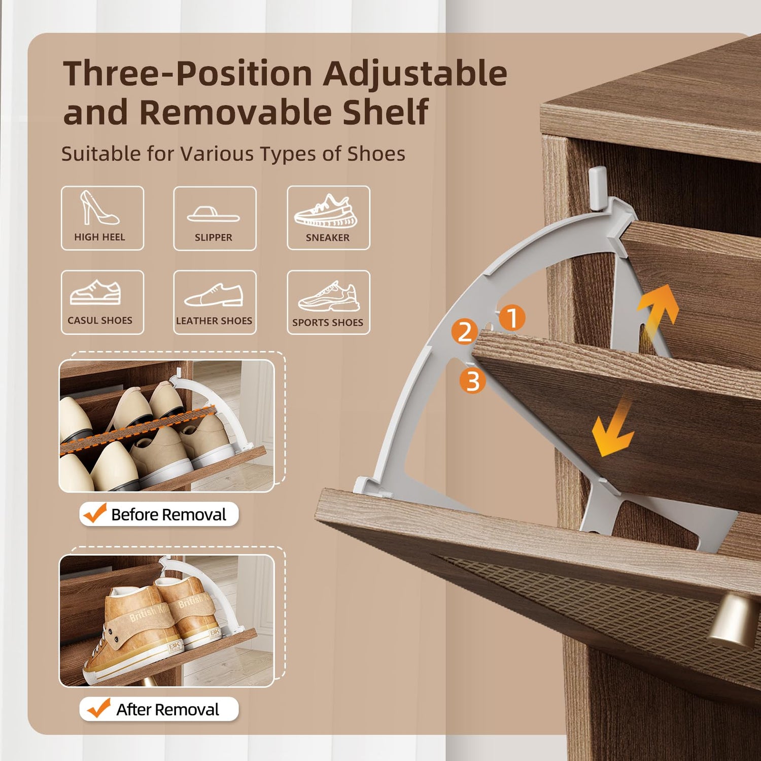 • Generous Storage Capacity: The spacious top drawer of the shoe organizer is ideal for keeping small items organized, helping to maintain a tidy environment. The flip-door section provides versatile storage options suitable for different footwear. Additionally, the cabinet features three adjustable partitions, allowing you to customize the middle section to fit various shoe types, such as flats, sneakers, and mid-calf boots.