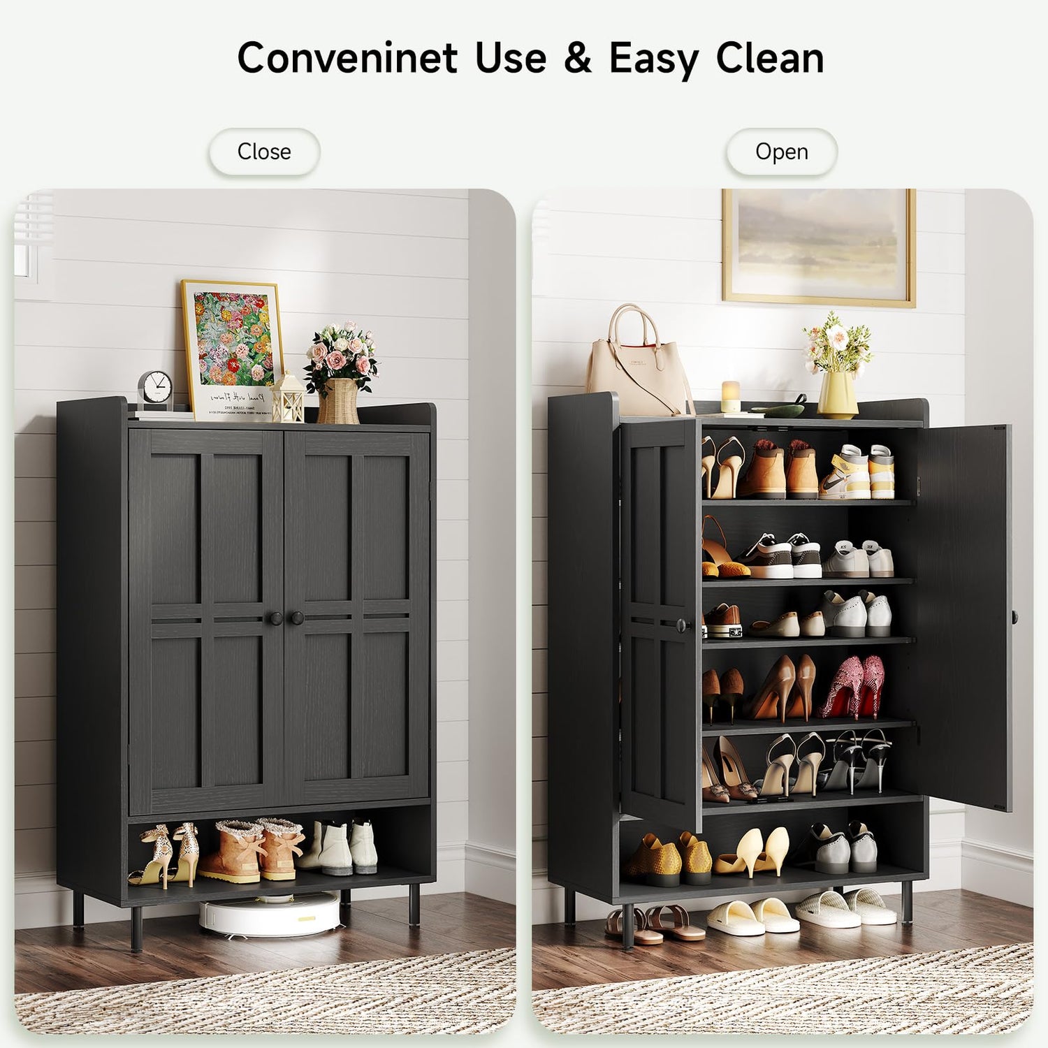 - Large Capacity Shoe Cabinet: Are you still worried about your excessive, cluttered shoes? Using this black shoe cabinet can help you solve the trouble. 5 hidden shelves and 1 open shelf can store 18-24 pairs of shoes, 3 adjustable shelves can be adjusted according to your shoe height, keep your shoes organized.