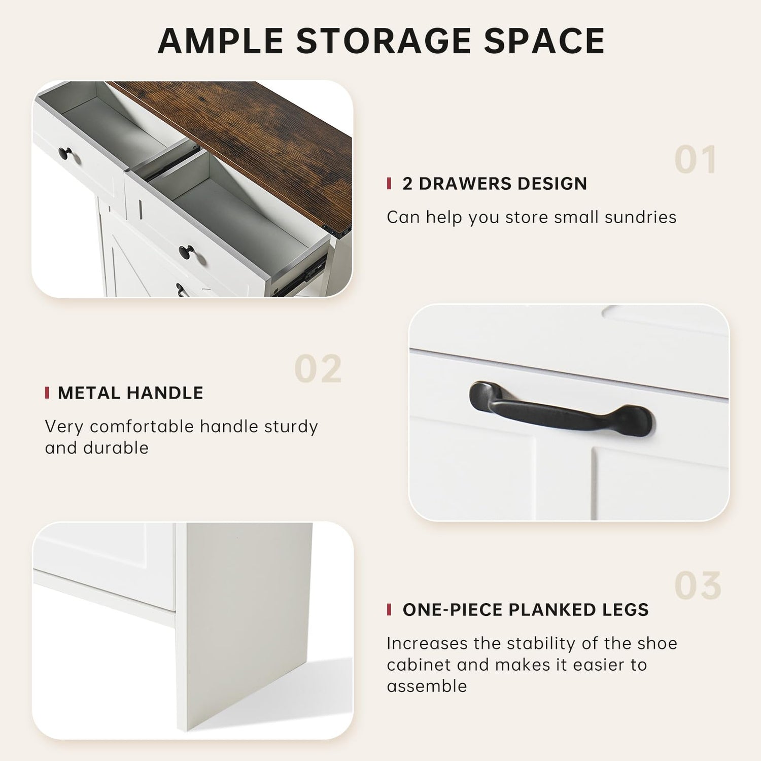 - Farmhouse Style: The shoe storage cabinet is simple and stylish, designed with a chic rustic white finish, blending well with country or vintage-inspired interiors. It is ideal for living rooms, entryways, hallways, living rooms or porches