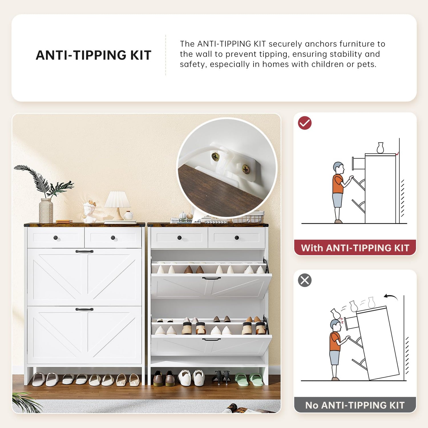 - Anti-Topping Device: Equipped with anti-tipping kit, our shoe storage can be securely fixed on the wall to prevent tipping, greatly ensuring the overall safety and stability especially when kids and pets in home