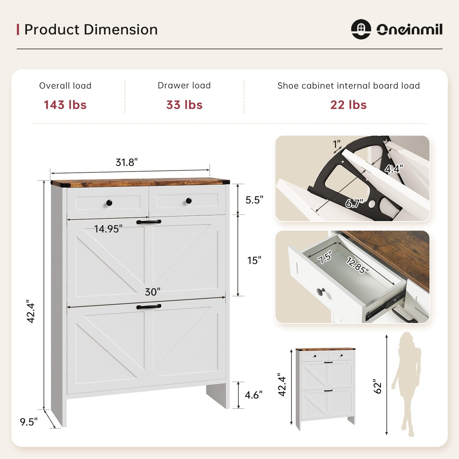 oneinmil Shoe Storage Cabinet, Farmhouse Shoes Organizer with 2 Flip Drawers & 2 Sliding Drawers, Freestanding Narrow Shoe Rack Cabinet for Entryway, Hallway, Living Room, White