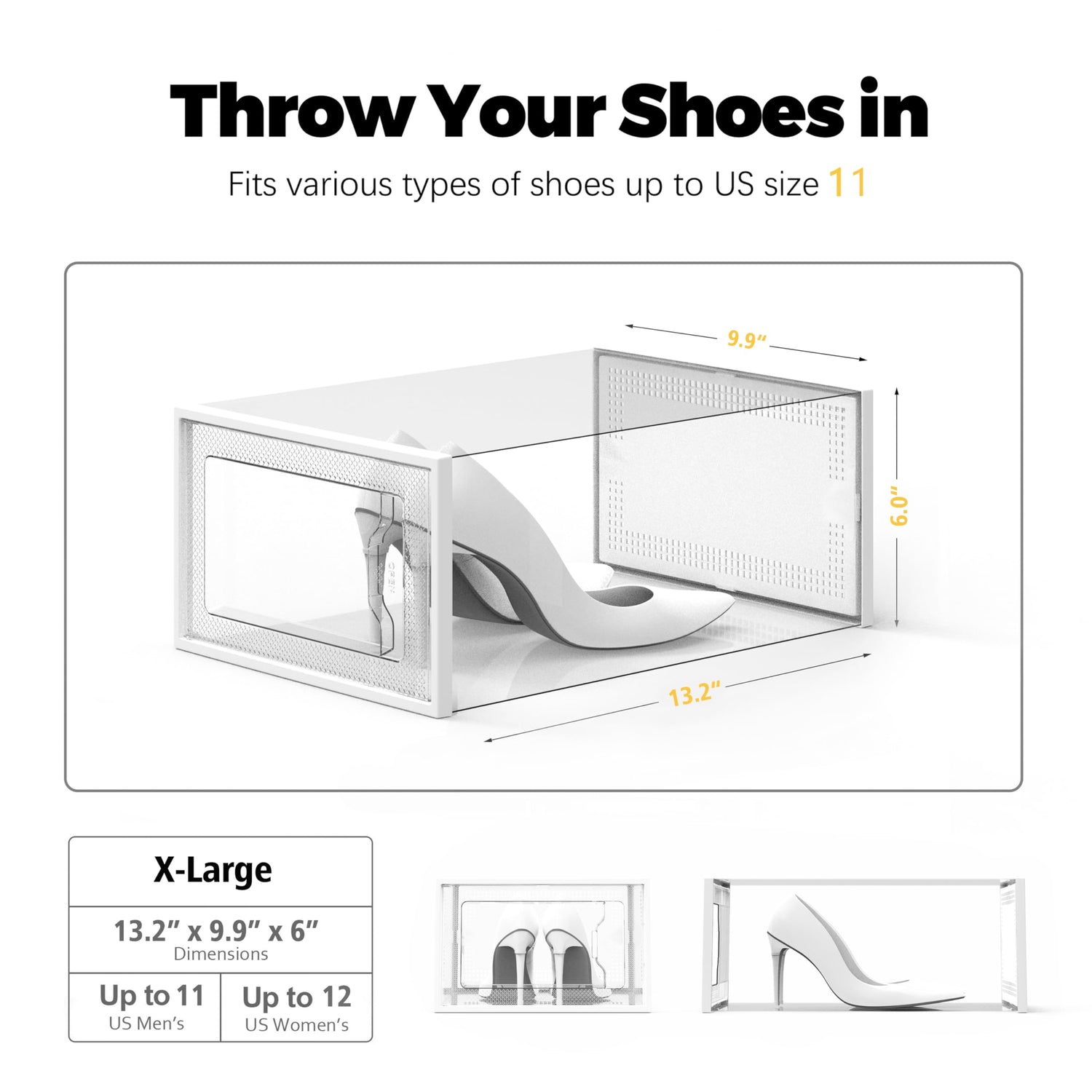 - Throw Your Shoes in: Each bin size 13.2''L×9.9''W×5.5''H Inch, fits various types of shoes up to US size 11; Heels, flats, sneakers, flip flops, sandals, wedges, all shoes are welcomed in these shoe containers.