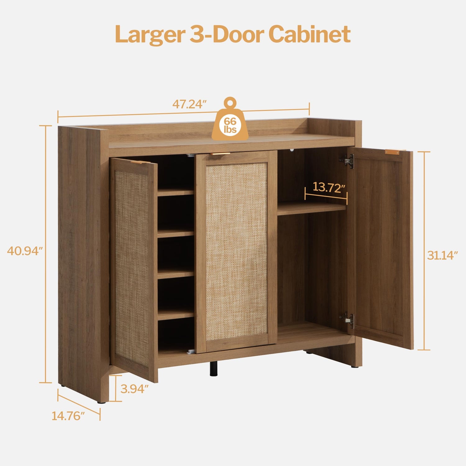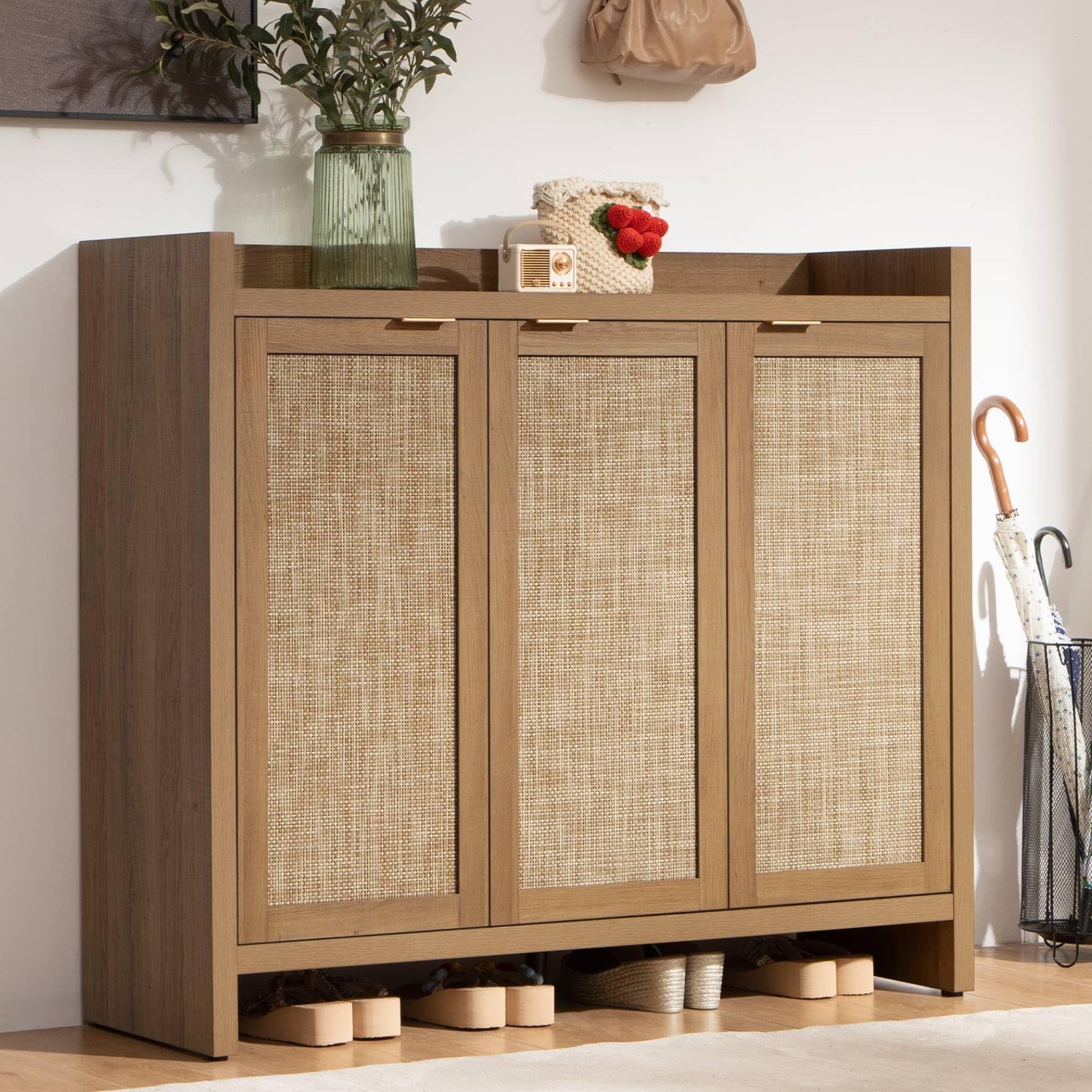 - 【Rustic Organizer】This shoe cabinet combines classic rectangular rattan doors, emitting rustic charm and bohemian vibes, making it a versatile addition to any home decor. Its unique three-door design effectively organizes the clutter at the entryway, ensuring no more shoes scattered everywhere.