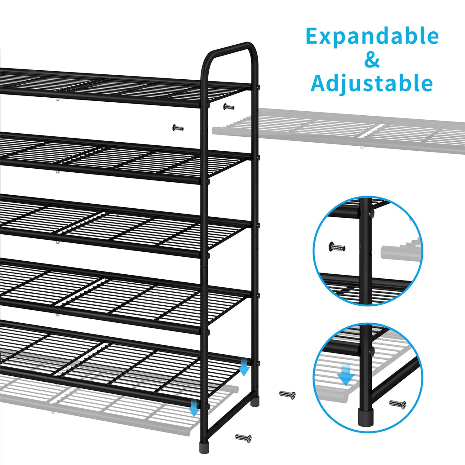 Simple Trending 5-Tier Stackable Shoe Rack, Expandable & Adjustable Shoe Organizer Storage Shelf, Wire Grid, Black