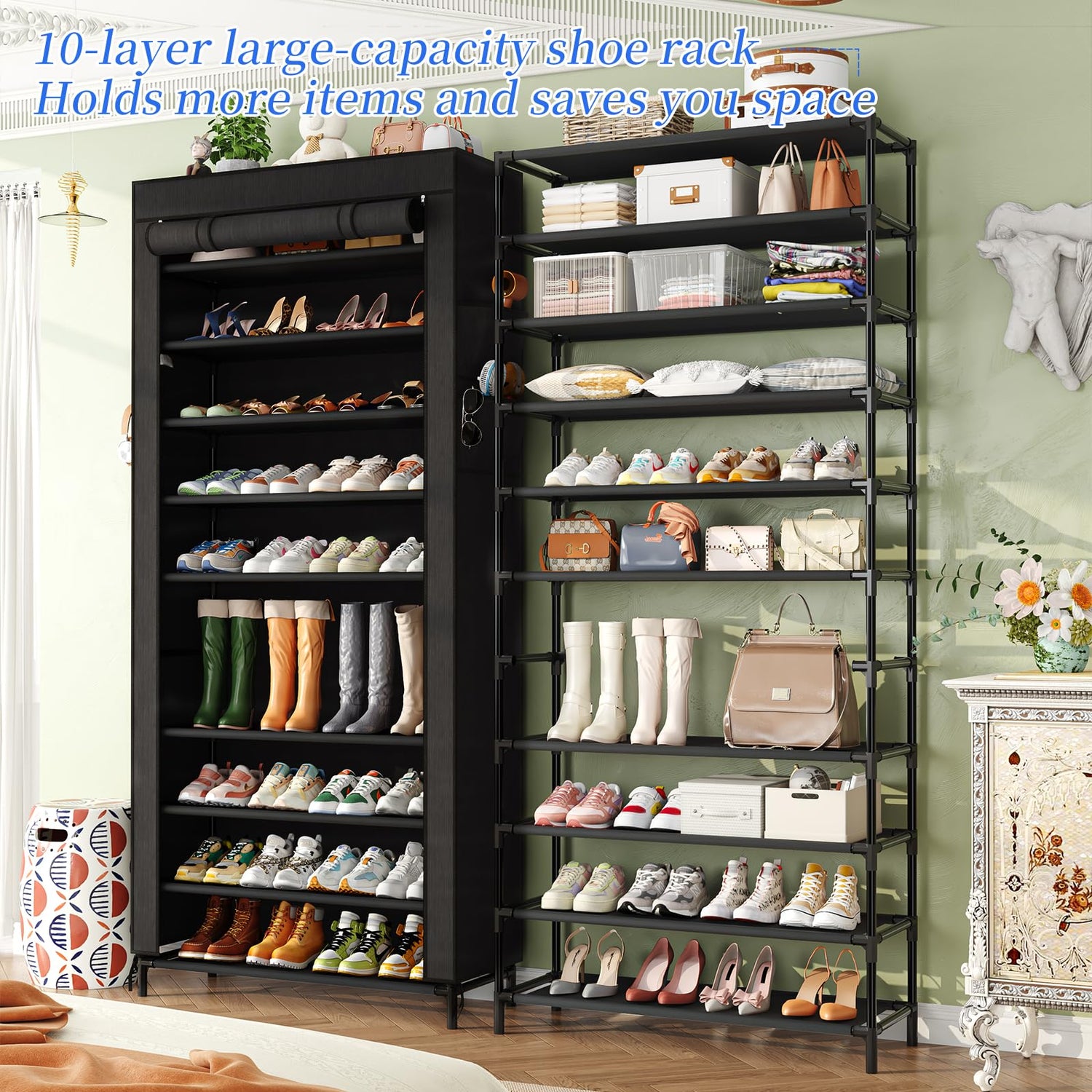 Simple Trending Tall Shoe Rack Organizer Holds 40 Pairs, 10 Tier Large Capacity Shoe Cabinet Storage with Cover for Closet, Black