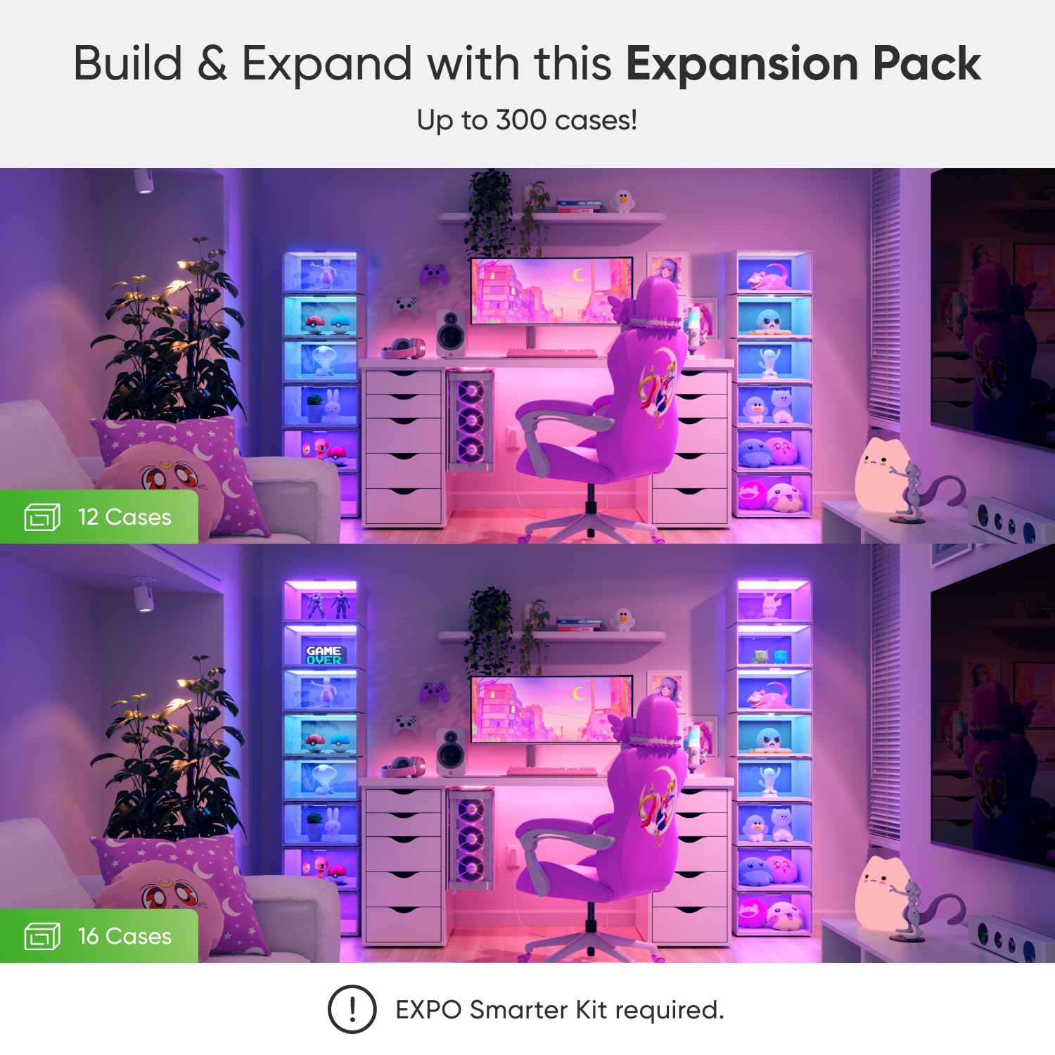 - [Stackable & Modular] Add this Expansion Pack to your existing Smarter Kit. Stacj cases in any arrangement that you like and automatically sync your layout to the app—for displays of up to 300 cases.