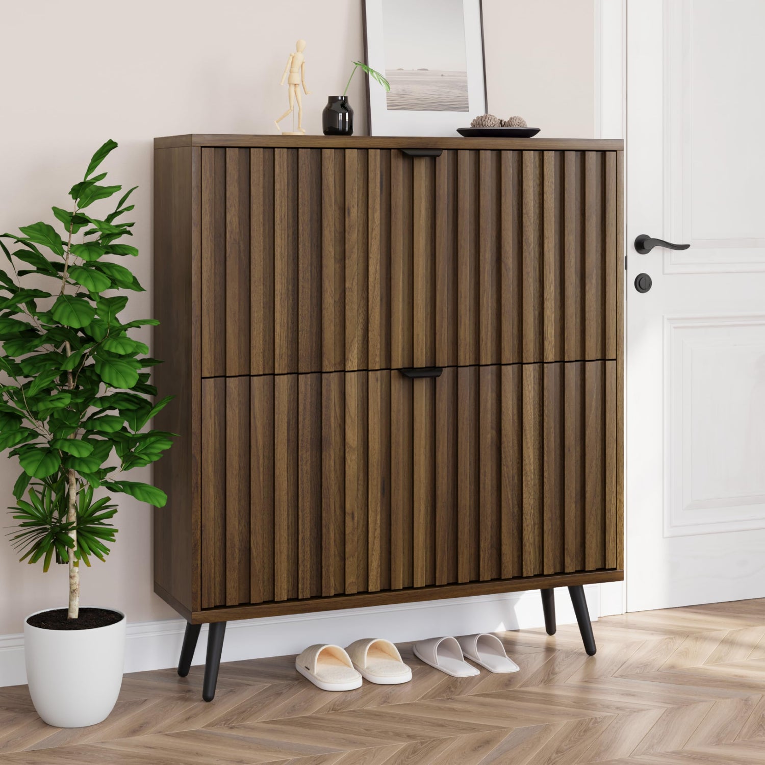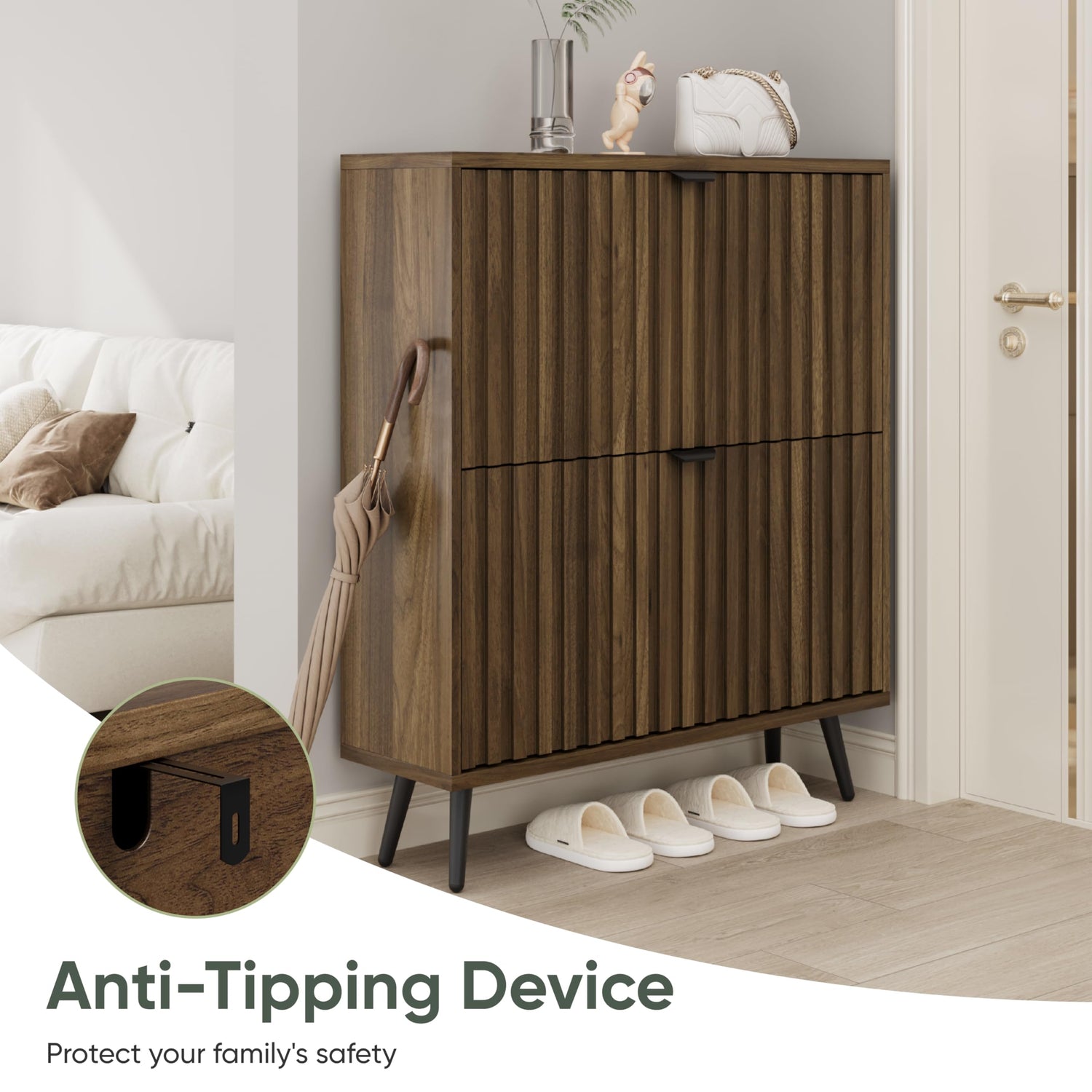 Smuxee Shoe Cabinet with 2 Flip Drawers, 31.5" Walnut Hidden Shoe Storage Cabinet with Fluted Design, Freestanding Shoe Organizer Cabinet for Entryway, Hallway, Closet, Living Room