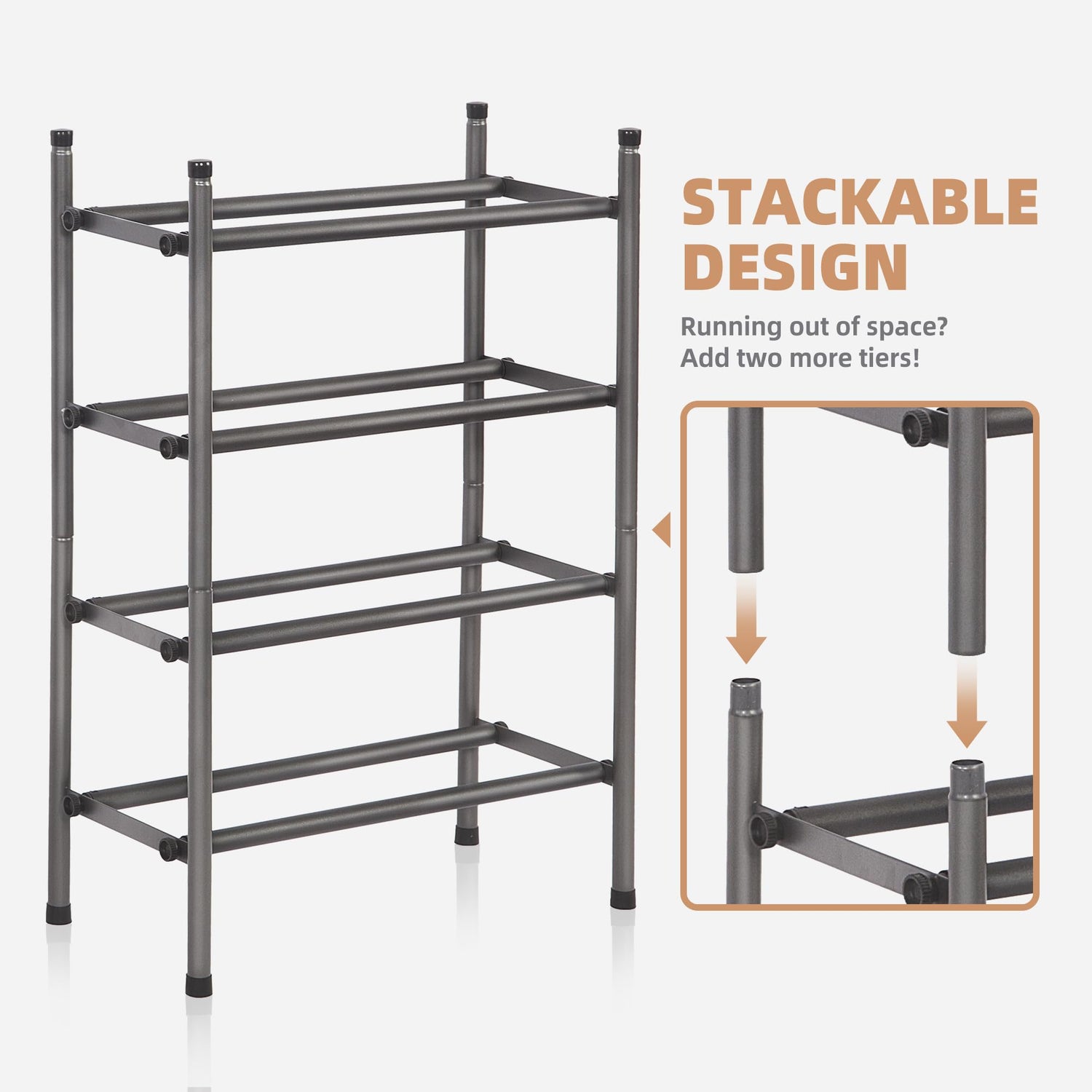 - STACKABLE - This shoe rack can save the floor space and maximize the use of vertical space. The 2 tier shoe rack can be purchased in any combination to meet different needs, like 4-Tier, 6-Tier, 8-Tier, 10-Tier etc. The metal shoe rack fits any small space
