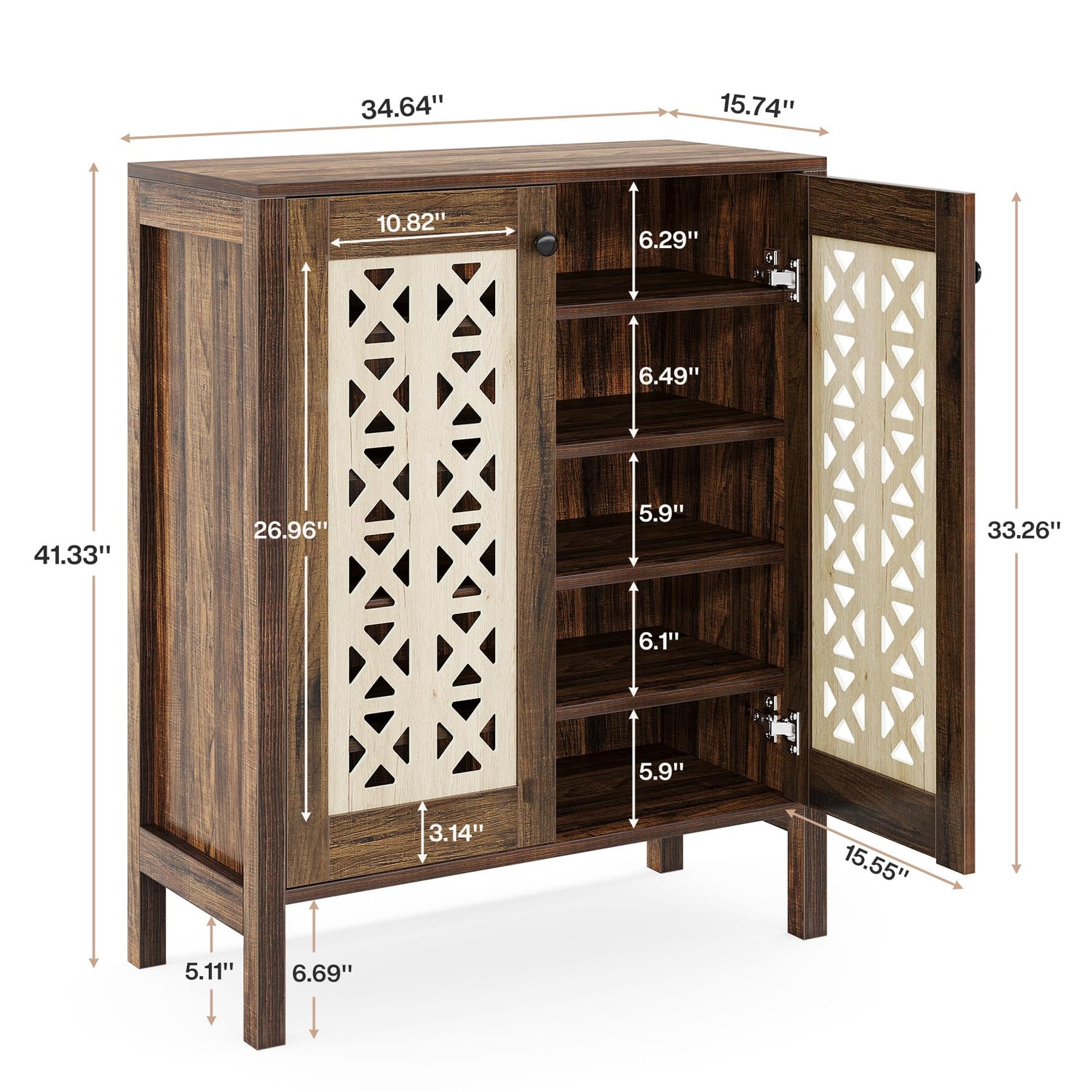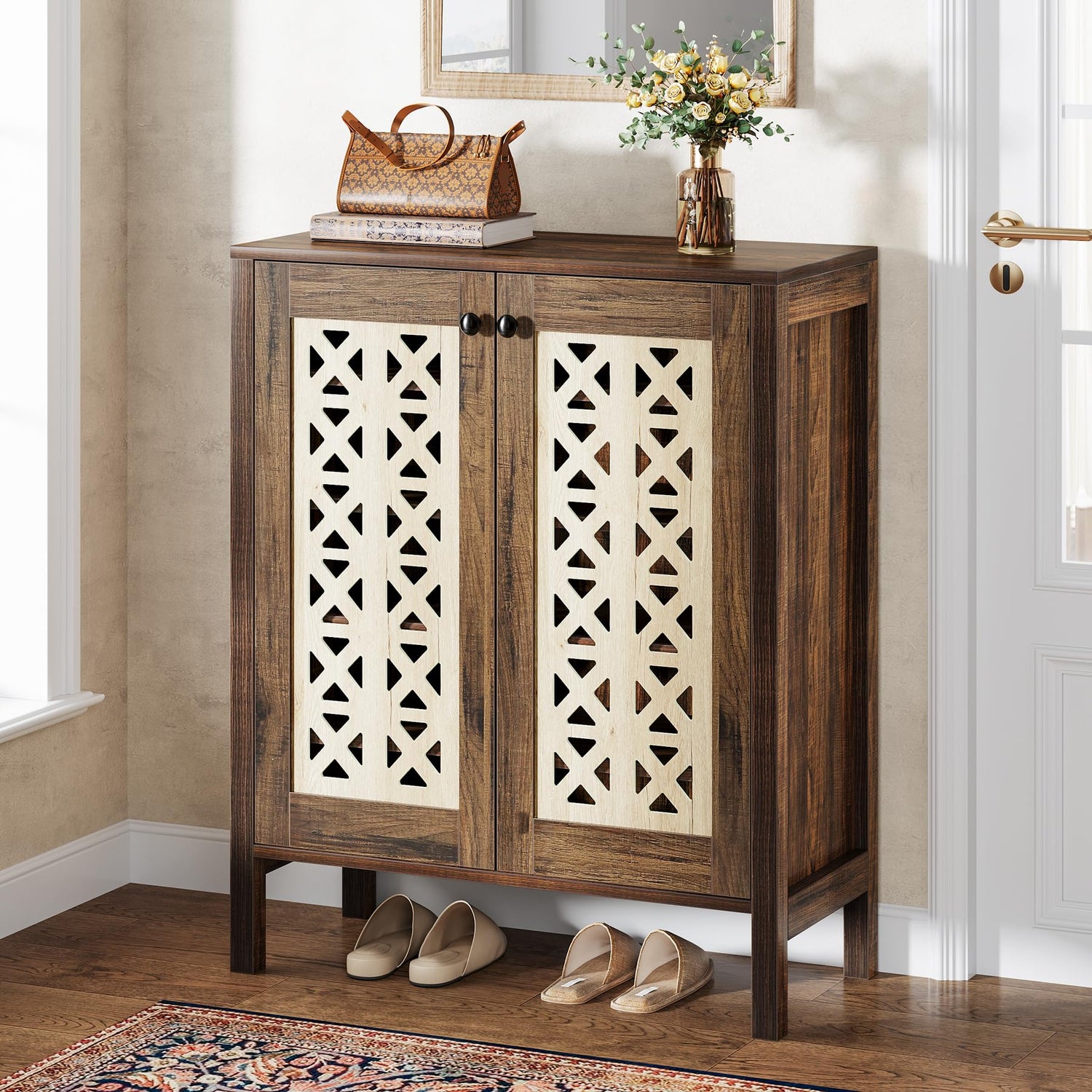 Details: Our meticulously designed shoe cabinet merges function with style, boasting a rustic farmhouse appearance true to classical aesthetics. One of the defining features of this exquisite entryway shoe storage is the hollow design on the doors, a testament to the incredible craftsmanship invested in its creation. The elegantly detailed pattern not only adds visual interest but also gives the wooden shoe cabinet an additional layer of sophistication.