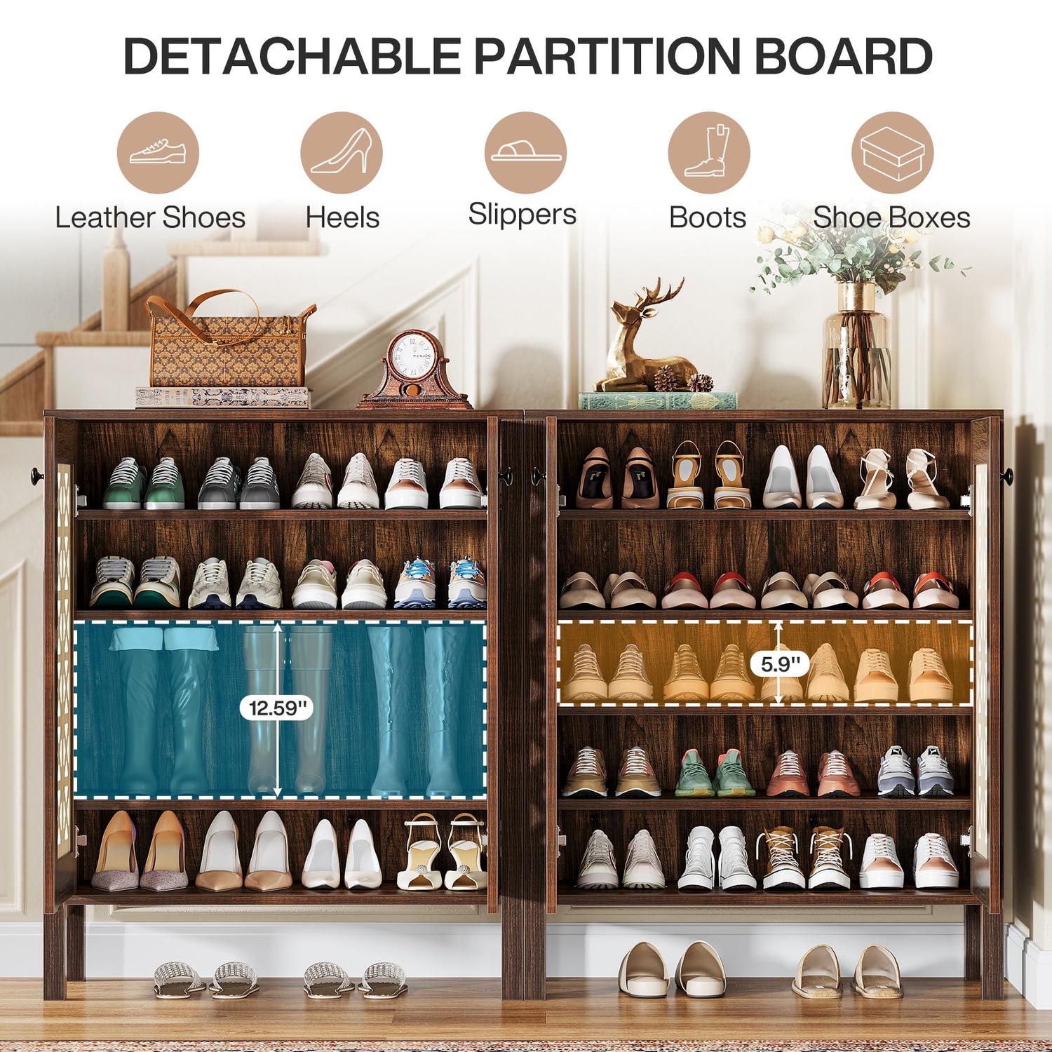 • Farmhouse Aesthetics: This shoe storage organizer, designed in an enchanting farmhouse style and embellished with intricate door engravings, enhances your living space's aesthetic appeal. It's an ideal blend of style and functionality