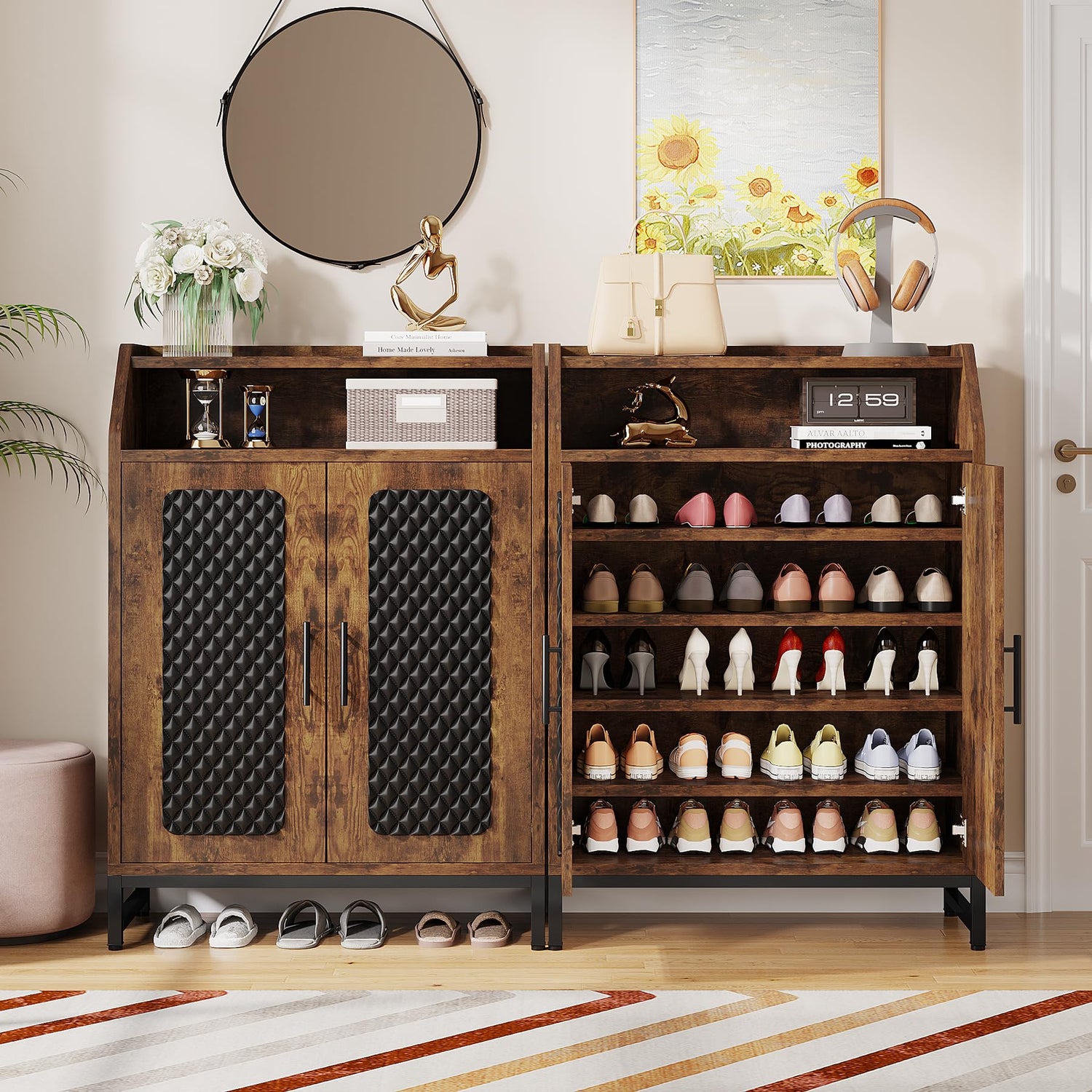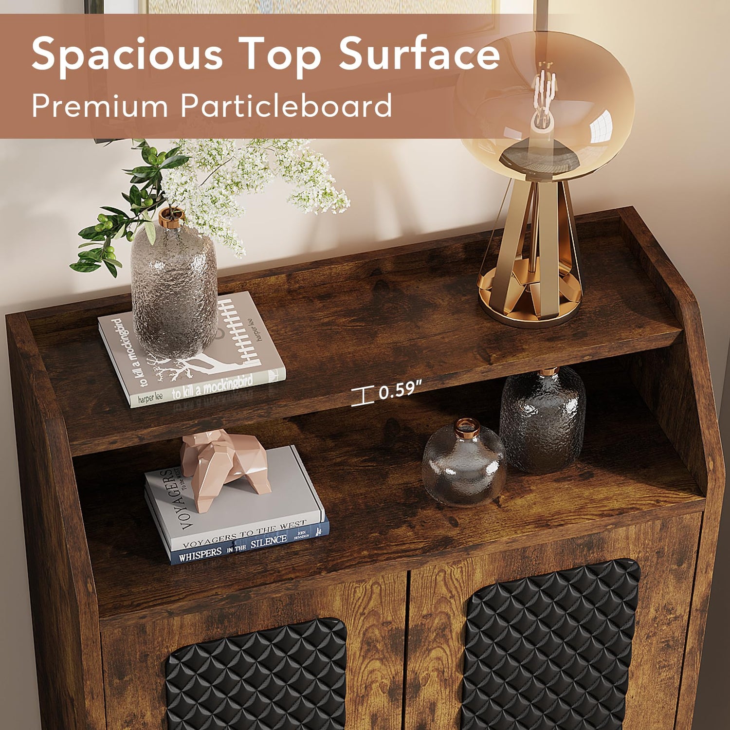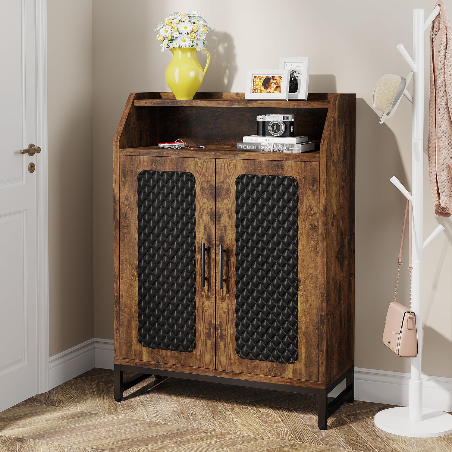 - 【Elegant Shoe Cabinet】: This wooden brown shoe cabinet is a stunning combination of beautiful design and functionality. And two doors feature unique PU leather design and elegant metal handles, making it more attractive. Smartly concealing shoes in the corner of the entryway or room to keep your living area clean and tidy. It will become a highlight of your entryway.